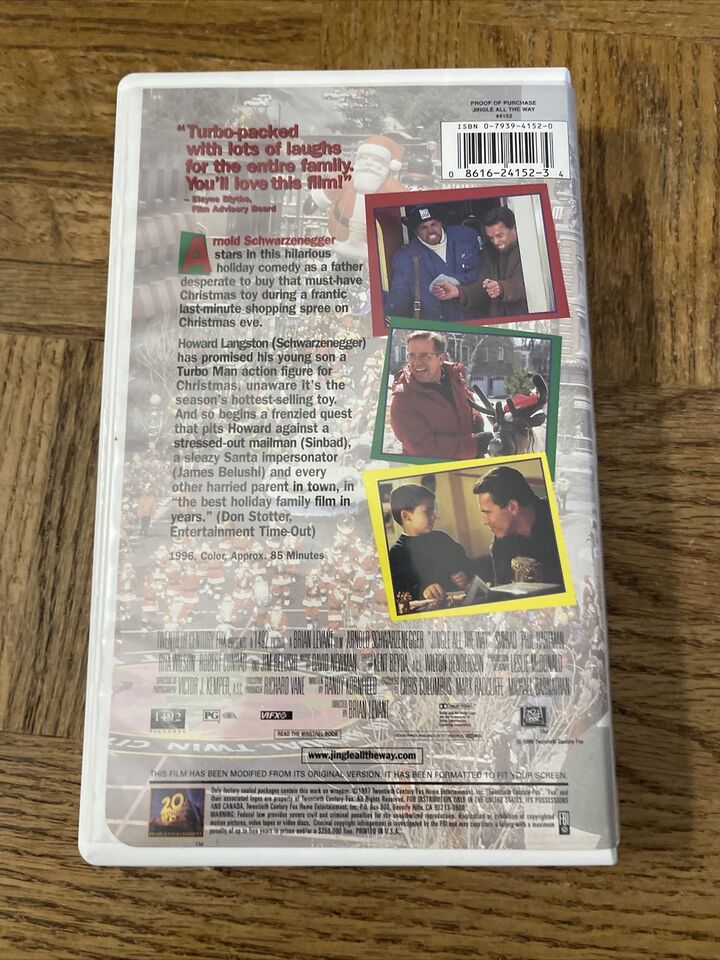 Join Schwarzenegger's character on a wild ride through the bustling city as he navigates through sold-out stores and unexpected obstacles to secure the toy of the season. This VHS tape is perfect for those who love live-action children's movies and is a great addition to any movie collection. Purchase now and enjoy the laughs and excitement of "Jingle All the Way" with your family and friends.