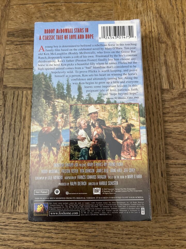 Experience the heartwarming story of a boy and his beloved horse in "My Friend Flicka" on VHS. Directed by Harold Schuster, this classic drama tells the tale of Ken and his bond with Flicka, a wild mustang. Starring Roddy Mcdowall and with a sub-genre of biography, this film is perfect for animal lovers and those who appreciate timeless storytelling.