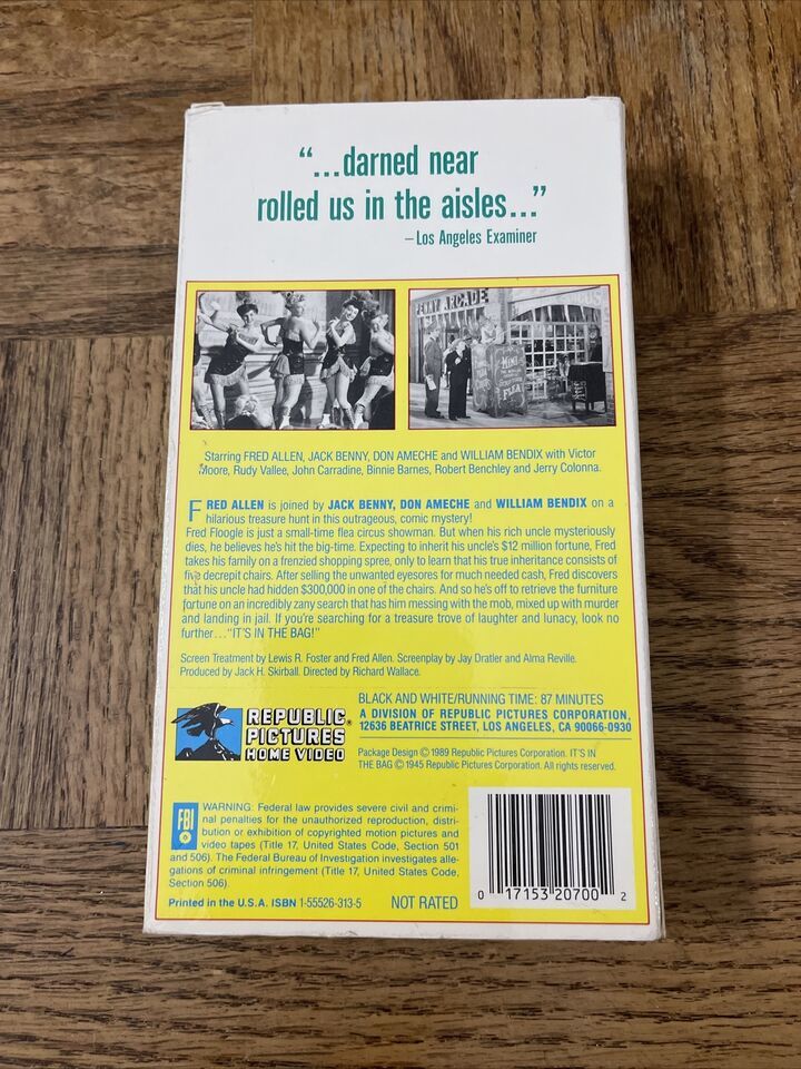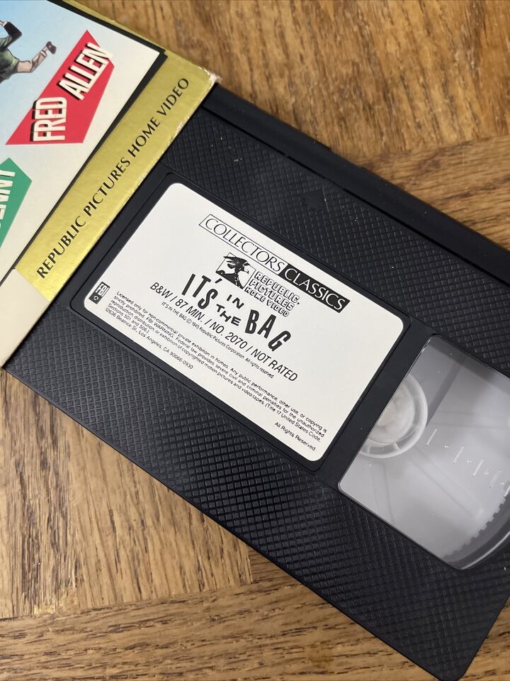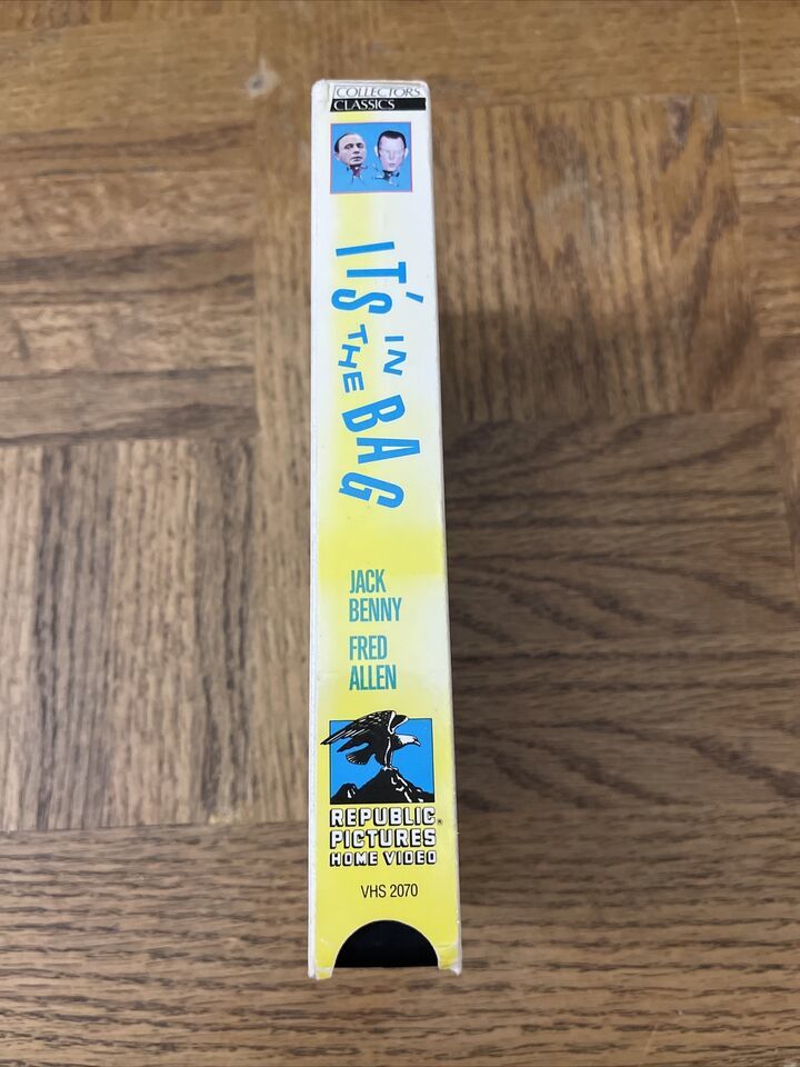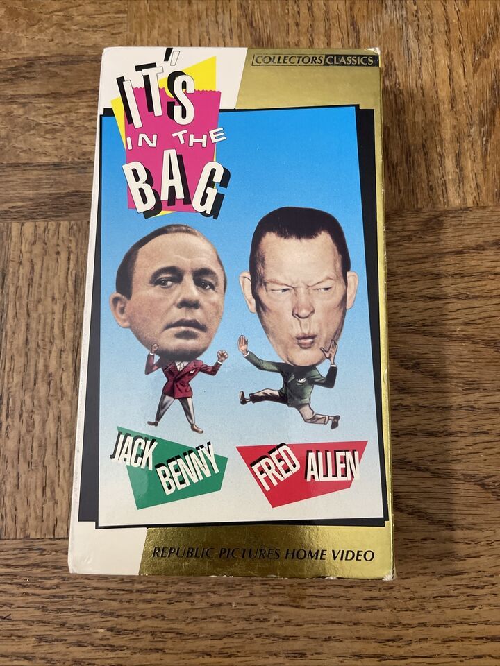 The movie/TV title is "It's In The Bag" and it's a great addition to any collection. The leading roles of Fred Allen and Jack Benny are sure to bring laughter and joy to any viewer. This VHS tape is perfect for those who love classic comedy and want to add a piece of history to their collection.