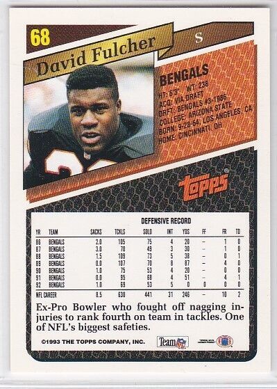 M) 1993 Topps Football Trading Card - David Fulcher #68