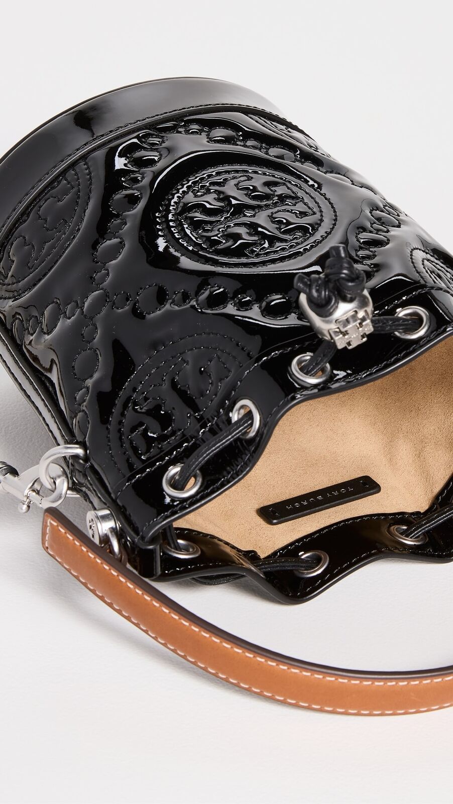 Tory Burch's T Monogram mini bucket bag is a chic addition to any ensemble. Crafted from 100% cow leather, this embossed patent bag is an example of the brand's commitment to quality and timeless style.
