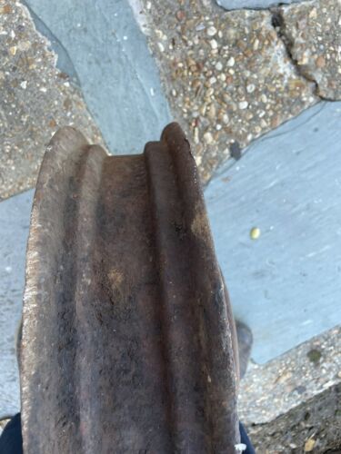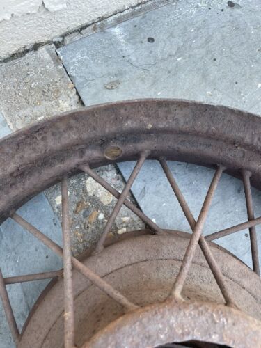 The wheel's unique design and rustic appearance make it a great fit for antique farm wagons, buggies, or man cave garages. Its interchange part number includes hot rod rat rod, yard garden flower bed art decor, and antique wire spoke rim wheel. This United States-made wheel is a vintage part that adds character and charm to any setting.