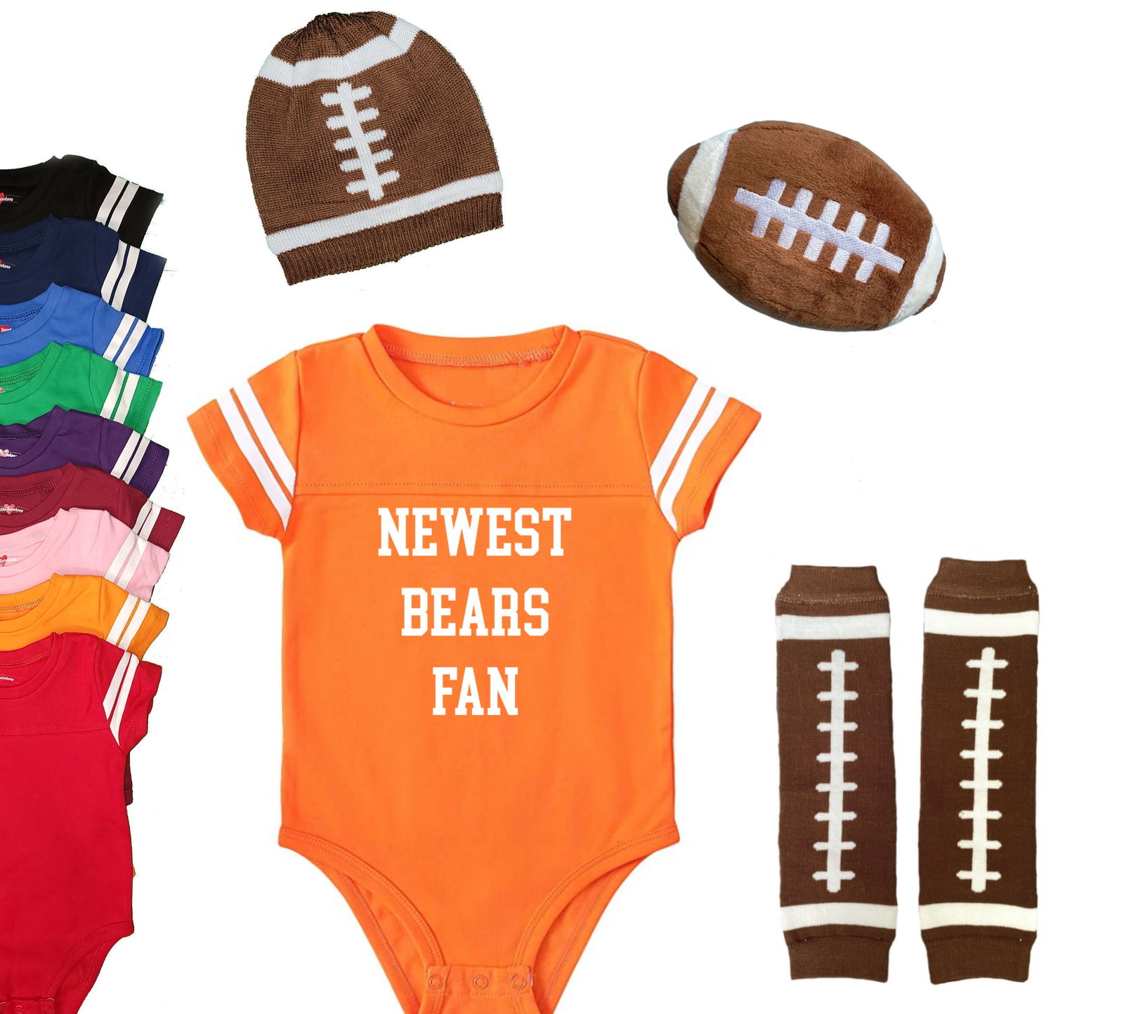 Our Football Leg Warmers make diaper changes a breeze and are extremely soft with a stretchy knit blend of cotton and polyester that keep baby legs comfy and warm!