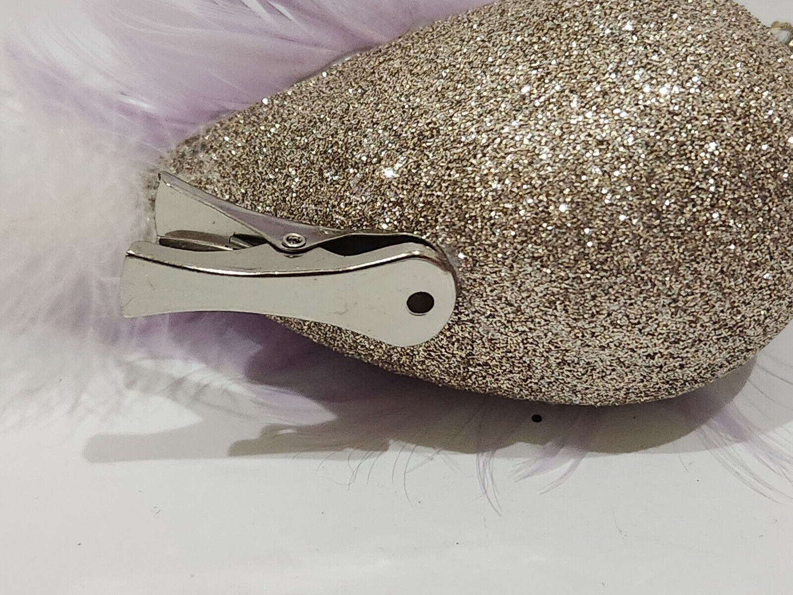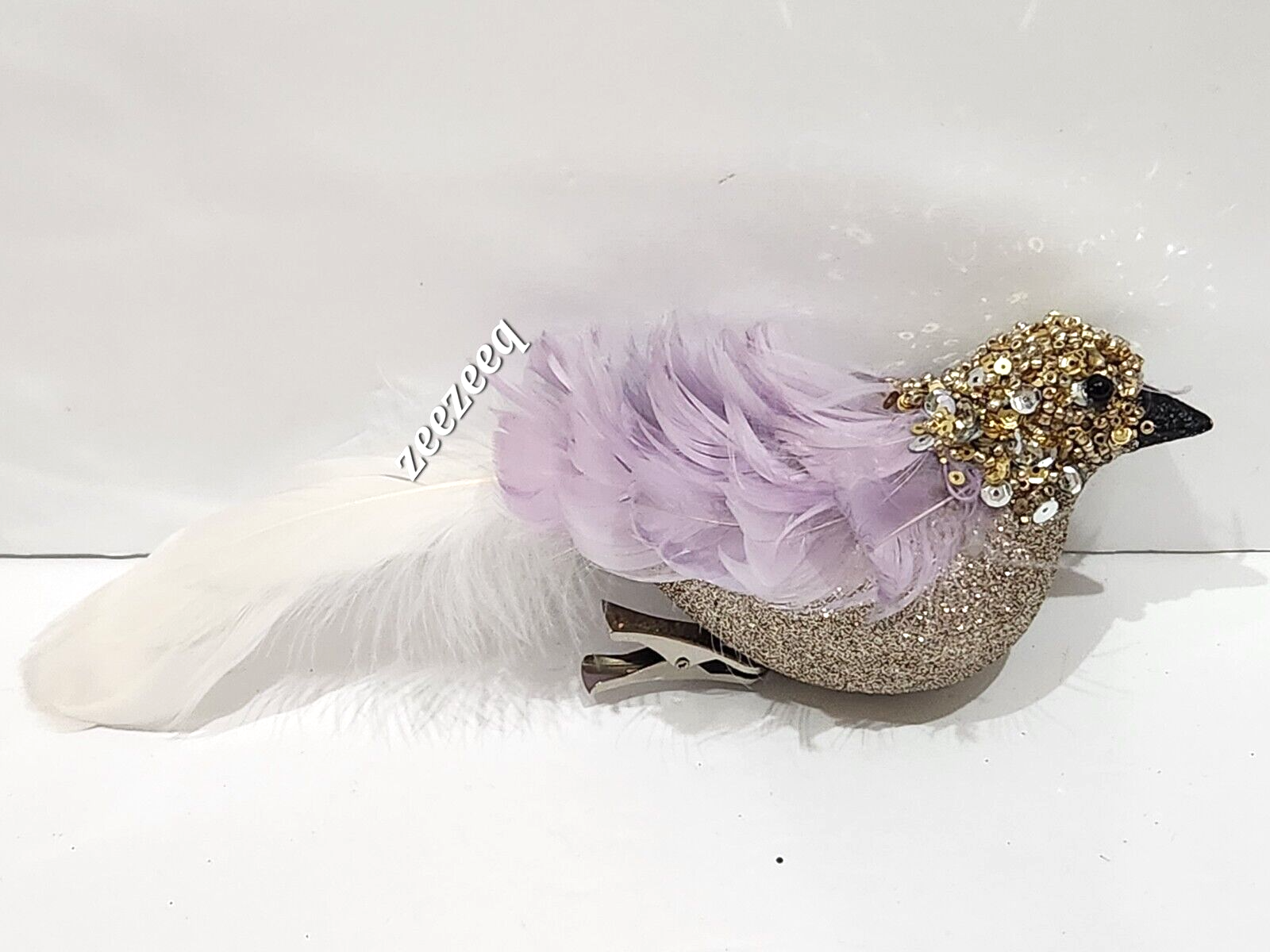 Up for sale we have these gorgeous lavender and gold glitter clip on bird ornaments. These will look amazing on a tree, wreath or garland. The birds are a beautiful lavender with gold glitter. Birds measure approx 5.5" long.