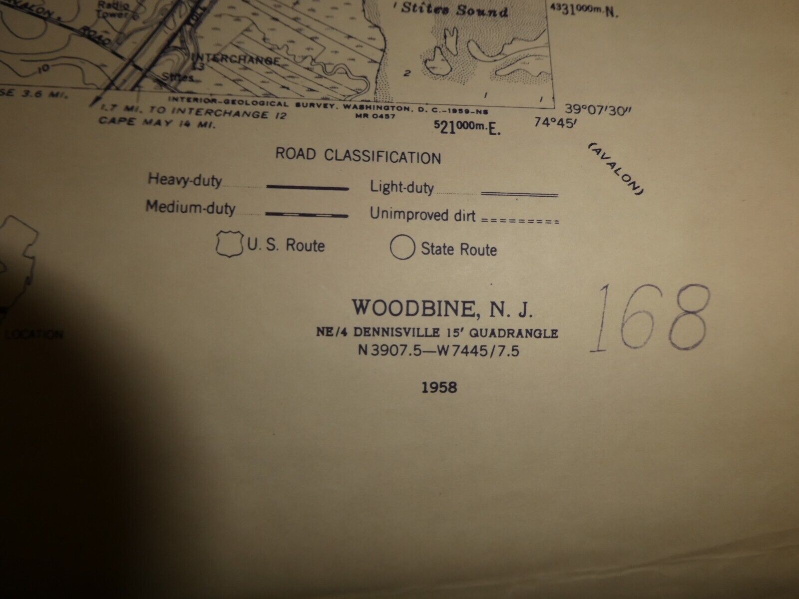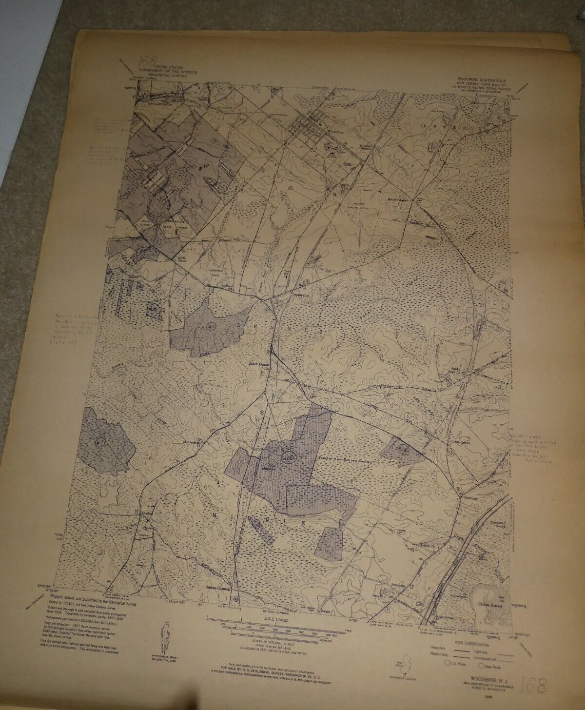 You are bidding on an original old map dated 1949 and it's from the United States Department of the Interior Geological Survey, United States Department of Commerce Coast and Geodetic Survey and features the Woodbine Quadrangle, New Jersey, Cape May County, 7.5 minute series, topographic. Very good shape, edge wear, some minor staining. Great piece to frame. About 22 inches wide and 3 feet tall.