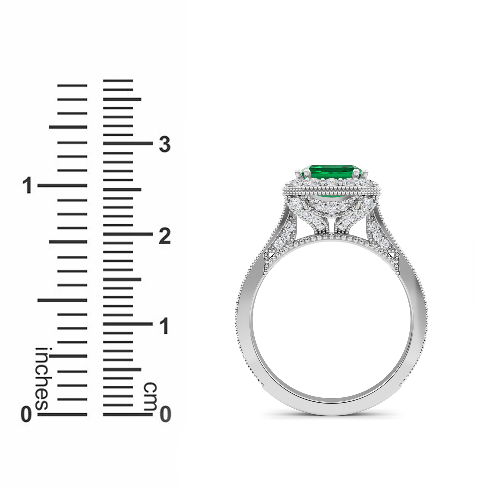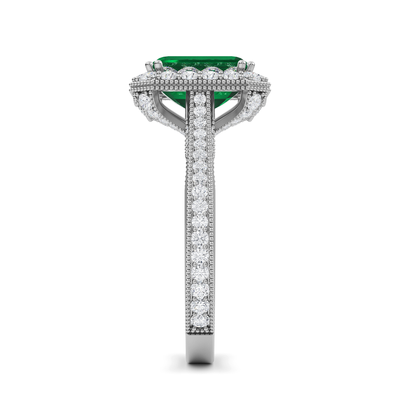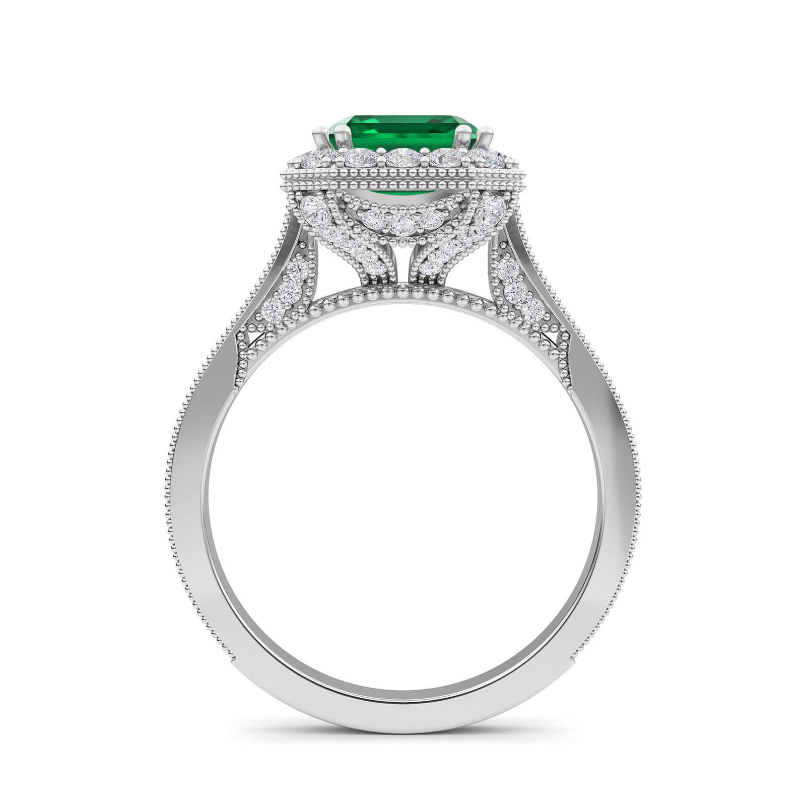 Finest Material :- Set in 10 karat white gold, This lab grown engagement ring carries the enchantment of vintage jazz and glitz with the 2.5 carat emerald cut diamond in the centre encircled by tiny shimmering round cut stones arranged in a classic studded prong creating a beautiful halo pattern. Antique milgrain lace adorns the halo on either side of the shank offering you impeccable radiance and sparkle.