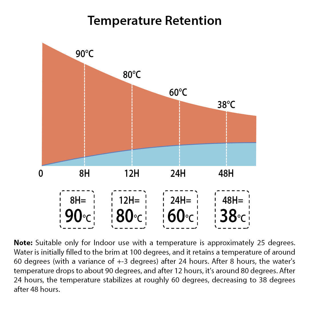 Note: Suitable only for Indoor use with a temperature is approximately 25 degrees. Water is initially filled to the brim at 100 degrees, and it retains a temperature of around 60 degrees (with a variance of +-3 degrees) after 24 hours. After 8 hours, the water's temperature drops to about 90 degrees, and after 12 hours, it's around 80 degrees. After 24 hours, the temperature stabilizes at roughly 60 degrees, decreasing to 38 degrees after 48 hours.