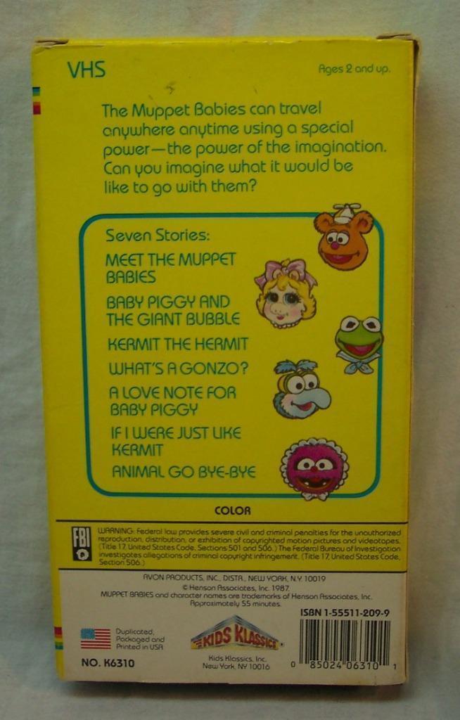 This is a Jim Henson MUPPET BABIES Favorite Video Storybooks VHS VIDEO from 1987. It has a runtime of 55 Minutes. It is in Great Condition. Box has minor wear from use, but nothing major. This was a promo item from AVON. Narrated by Kermit the Frog. Combine auctions to save on shipping. Please contact me if you need to make other payment arrangements. EAG