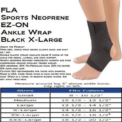 Description : FLA Orthopedics Sports Neoprene EZ-ON Ankle Wrap Black X-Large FLA EZ-ON Wrap-Around Ankle Support This wrap around ankle support provides excellent compression and stabilization to weak or injured ankles. The foot and ankle portion is made with sports neoprene for consistent compression and therapeutic warmth to the joint and soft tissues. The top portion is made with Tri-Permalon for cool, breathable wear. A double elastic strap offers adjustable compression to both sides of the ankle and arch of the foot by simulating taping of the ankle in a figure-eight pattern. Great for nighttime wear to treat ankle injuries and control the edema associated with sprains and strains. Color: Black. Indications Mild sprains/strains juvenile arthritis. Tendonitis. Strains/Sprains. Weak ankles. Goals Improve comfort. Increase ankle compression. Decrease anti-inflammatory medications. Decrease ankle pain symptoms. Improve joint stability. Reduce ankle swelling. See our store