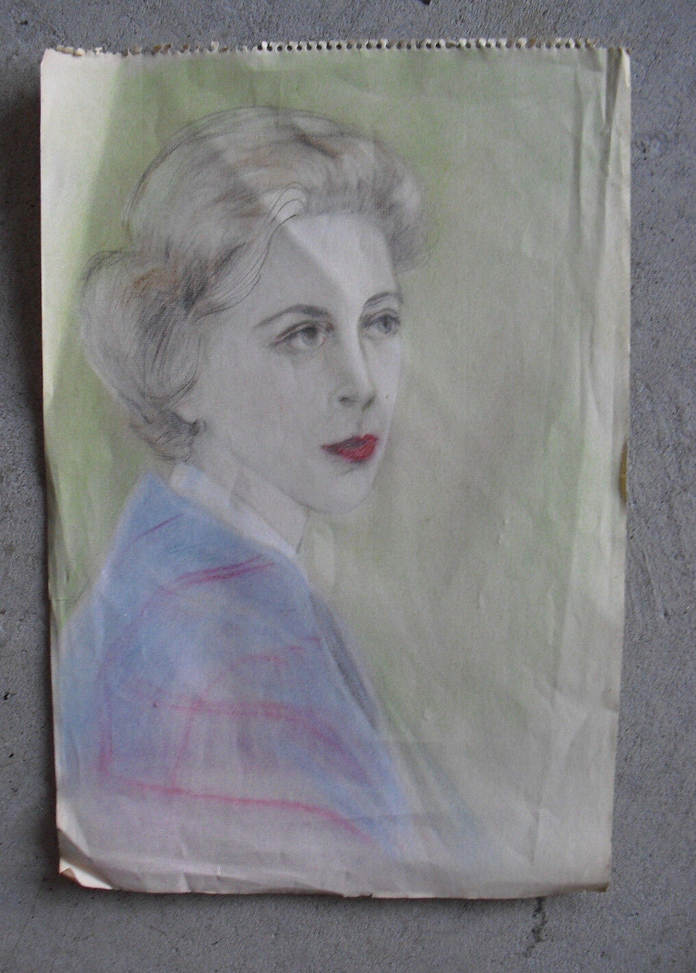Original Vintage Colored Pencil Drawing - Portrait of Short Hair Blonde Woman
