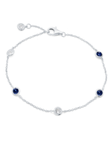 This delicate bracelet features small (4 mm) bezel set clear and sapphire color cubic zirconia on a platinum-plated chain with a lobster clasp. You can wear it alone or layered with other available chain bracelets.