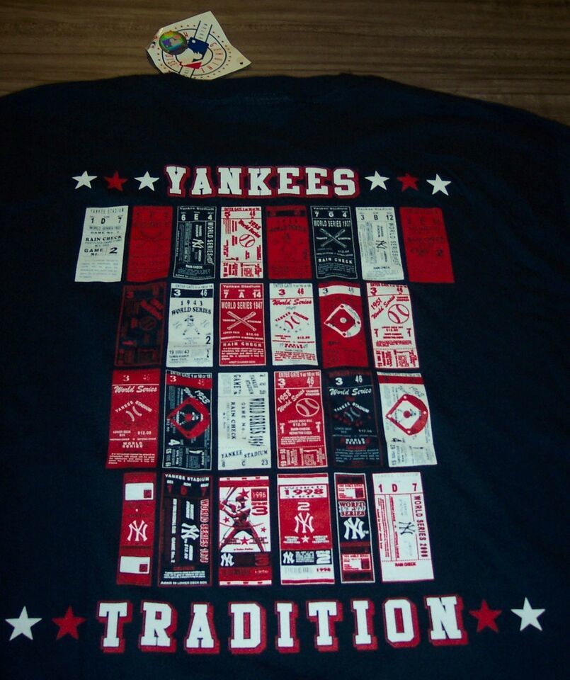 This is a VINTAGE STYLE NEW YORK YANKEES WORLD SERIES HISTORY MLB BASEBALL T-shirt. It has no size tag, but it is a size MEDIUM and it is NEW with the tag. It is 22 inches from armpit to armpit and 29 inches in length. It is an official MAJESTIC Shirt. Really Cool Shirt with World Series Pennant flags on the back. This shirt was part of the promo for the last season at the original YANKEES STADIUM. Combine auctions to save on shipping. SAG