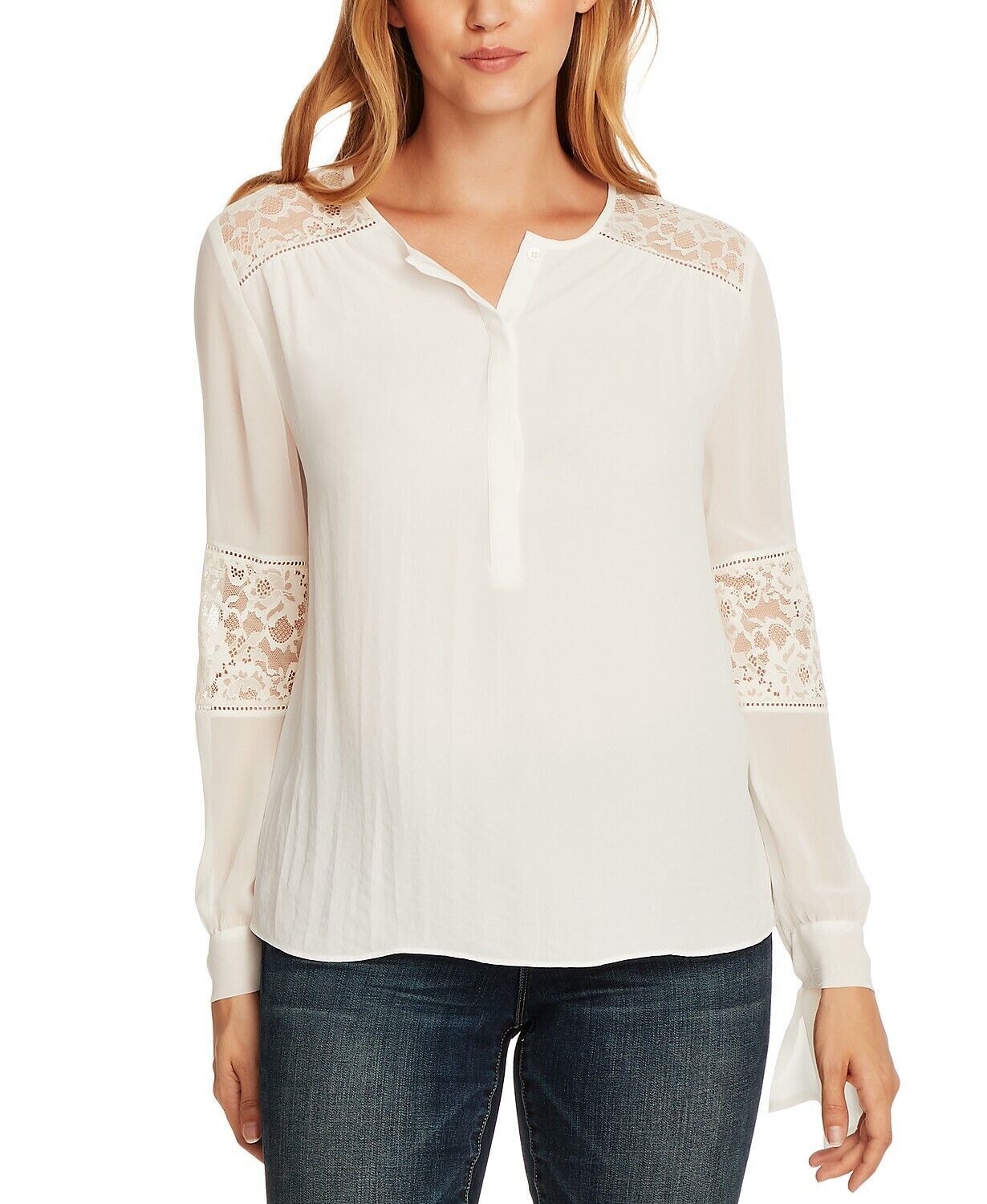 Vince Camuto Tie-Cuff Lace-Trim Rumple Blouse - Pearl Ivory - textured blouse with pretty lace. Casual to wear to work.
