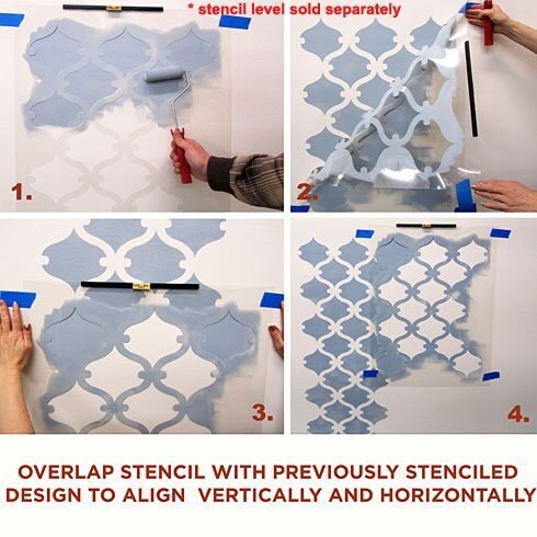 While prior stenciling experience is helpful for allover stencil patterns, even beginners get great results! This design is recommended for feature/accent wall or entire room. It also works for furniture and fabric embellishment.