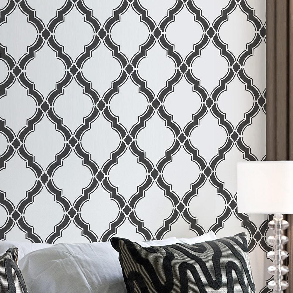 We love this sophisticated Moroccan stencil Agora! Based on a traditional pattern with added detail, this trellis design is perfect for accent walls in guest bedrooms, hallways or dining rooms. Offered in 2 sizes (scales), so choose one that perfectly fits your space. In general, larger scale is better for larger rooms, and vice versa. Larger scale is also great for stenciled rugs and curtains.