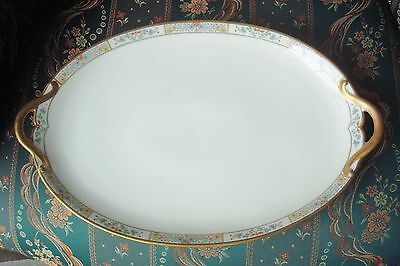 Antique Gerard, Dufraisseix Abbot (GDA) France, oval server tray, exquisite border decorations and gold handles, very good condition, no damage., some light surface scratches commensurate with age, 17" by 11"