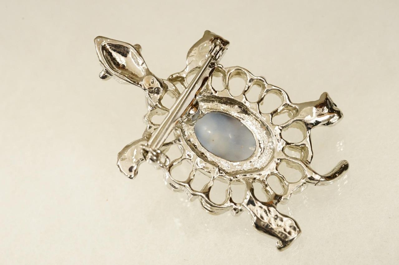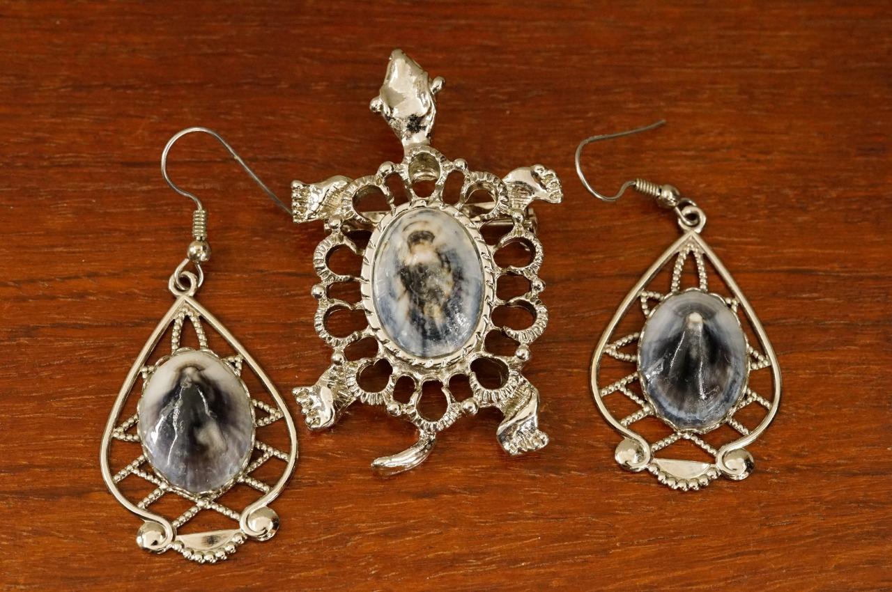 Vintage Costume Jewelry Limpet Shell Turtle Brooch Pin Earring Set Silver Tone