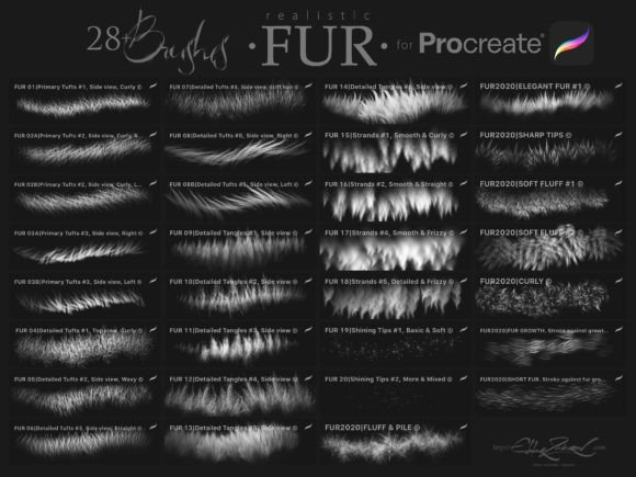Twenty brushes remastered from the first ‘FUR’ brush set + 8 new brushes. The brushes depicting fur from the side view (brushes # 2, 3, and 8) have two options for each one: the left and right hair growth direction. Therefore, there are actually three more brushes in the set — 31.