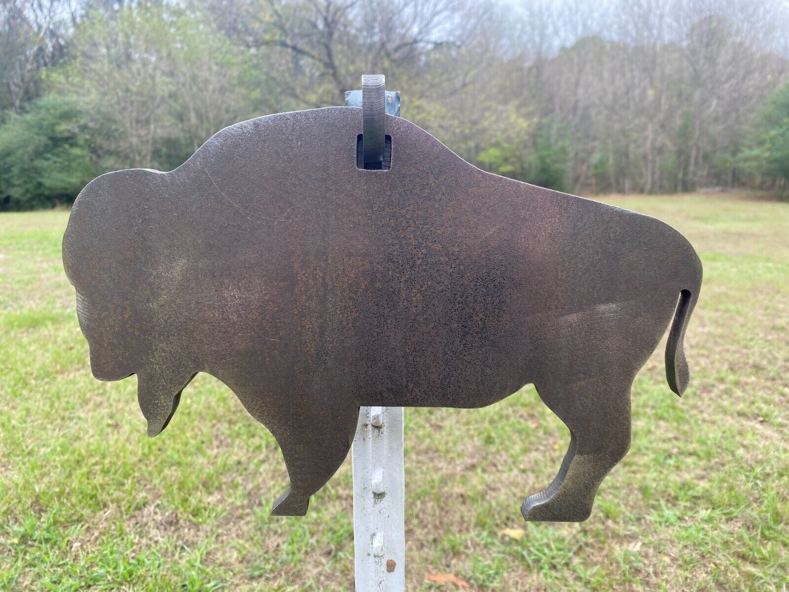 Set includes one 3/8" AR500 16" x 24" Cowboy Action Buffalo Silhouette CAS target with one 1/2" diameter square hole for mounting with a 1/2" carriage bolt or one of our 3/8" AR500 t-post hooks (sold separately, shown in image 2).