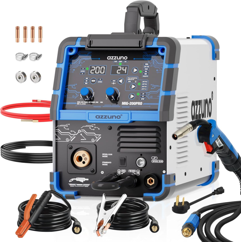 ?8-IN-1 MULTIPROCESS WELDER?: The AZZUNO 8-in-1 Multifunctional MIG Welder combines versatility and power, supporting a wide range of welding functions, including Flux Core MIG, Gas MIG, MAG, Aluminum MIG, Spot MIG, Lift TIG, Stick Welding, and Spool Gun compatibility. This all-in-one machine is designed for maximum flexibility, making it ideal for both beginners and experienced welders. (tig gun and spool gun not included,WP-17V-35,LBT150).