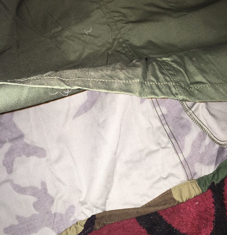 Water Repellent Outershell : 50 % Cotton / 50 % Nylon, Lining : Nylon Cotton Blend Concealed Hood, Heavy Brass Zipper w Coated Green Protection Snap-Up Storm Flap, Epaulets, Waist, Hood Bottom Drawstrings, Four Snap-Up Pockets, Removable Quilted Button-In Liner, Hook Loop Cuffs for Attachment to Gloves.