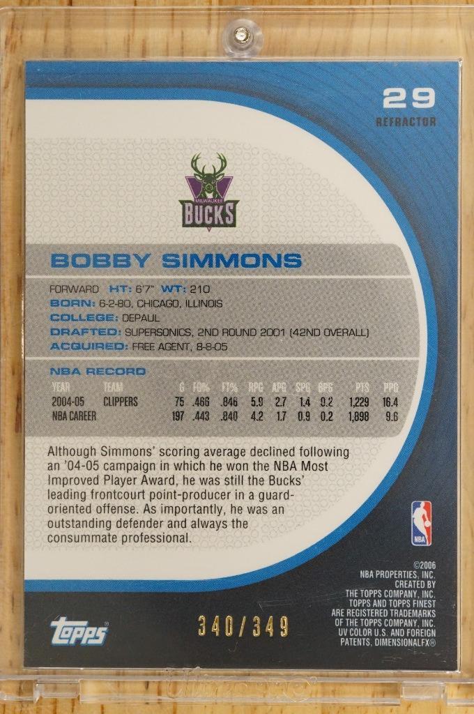 2005-06 Topps Finest Refractor Bobby Simmons #29 Milwaukee Bucks 340/349. Present in a one touch.