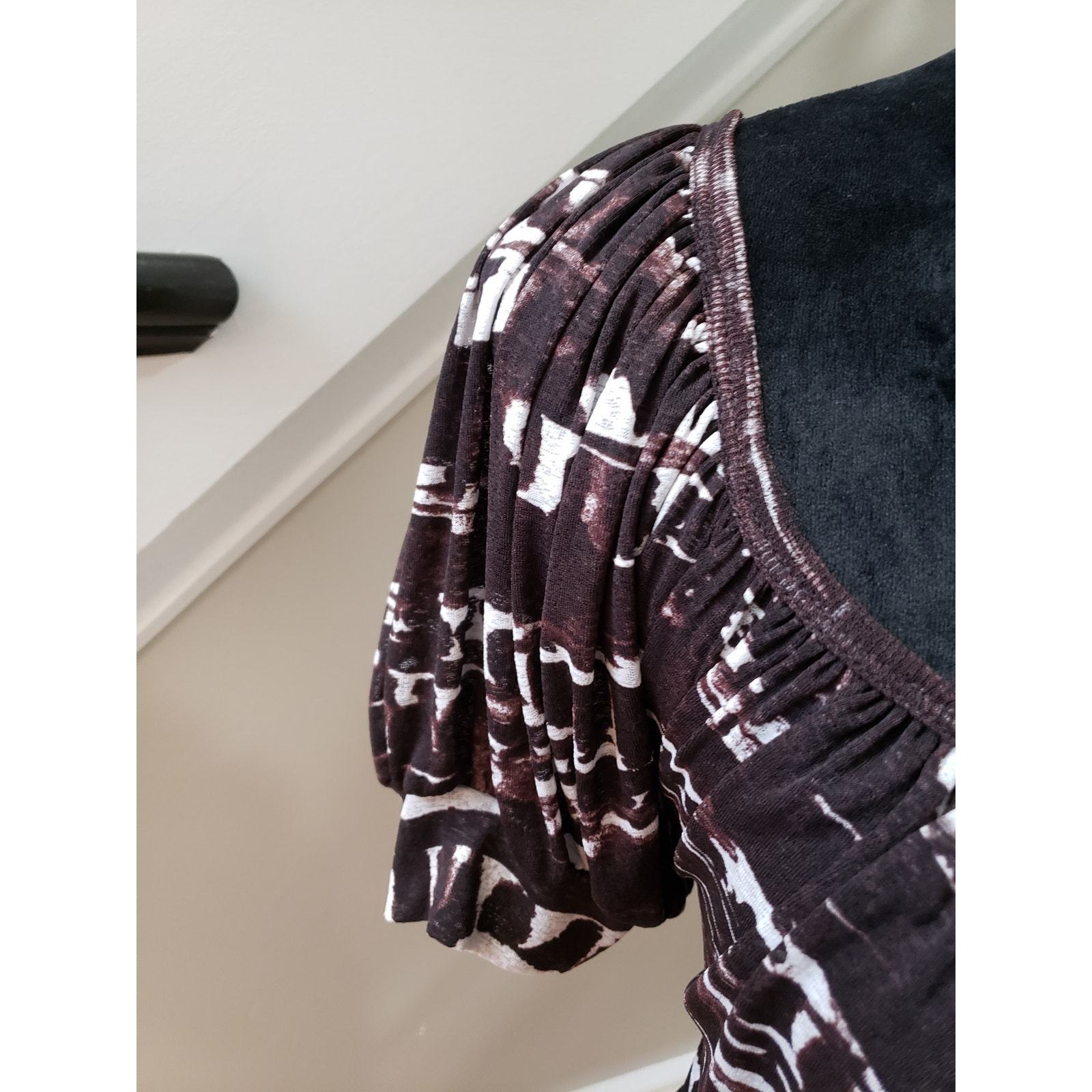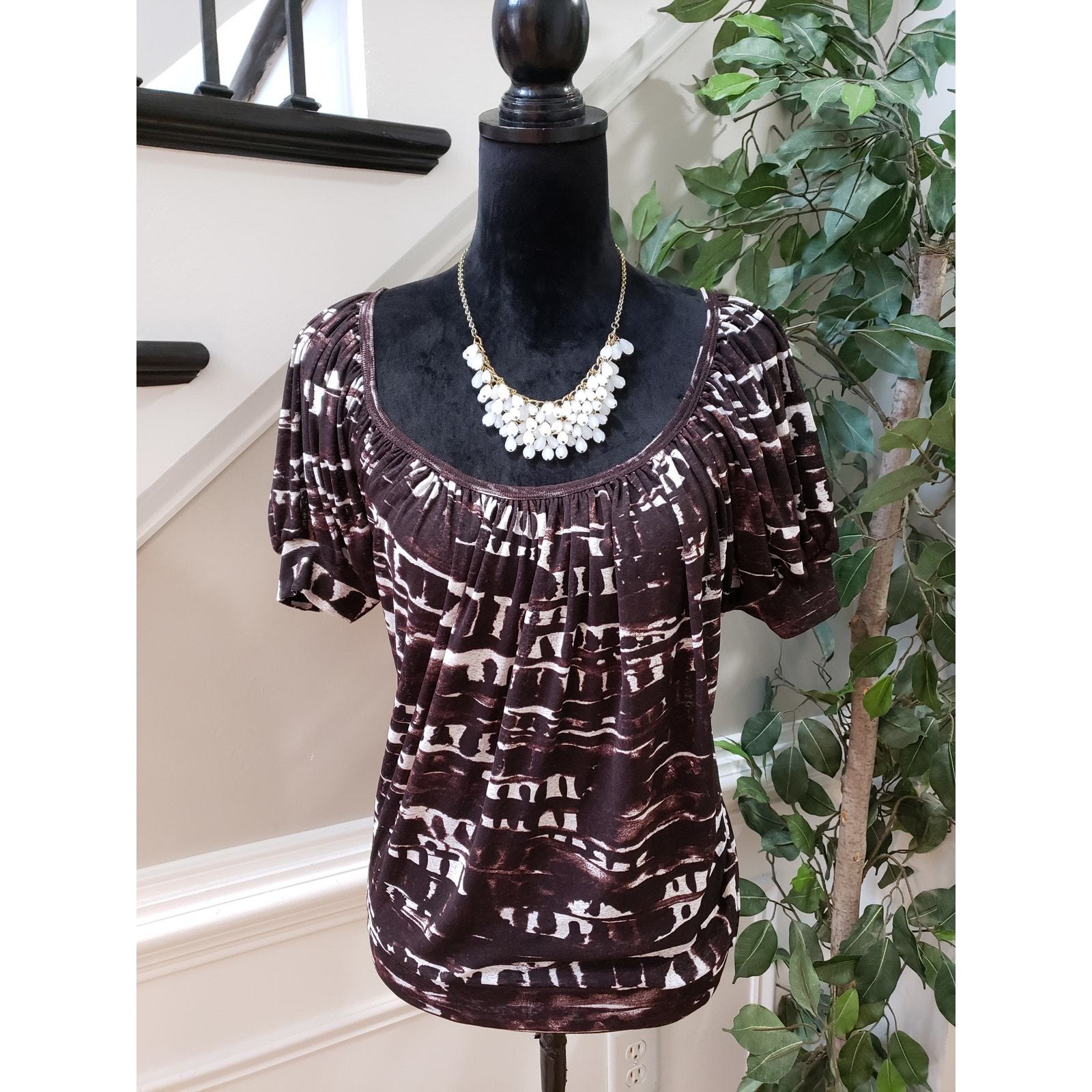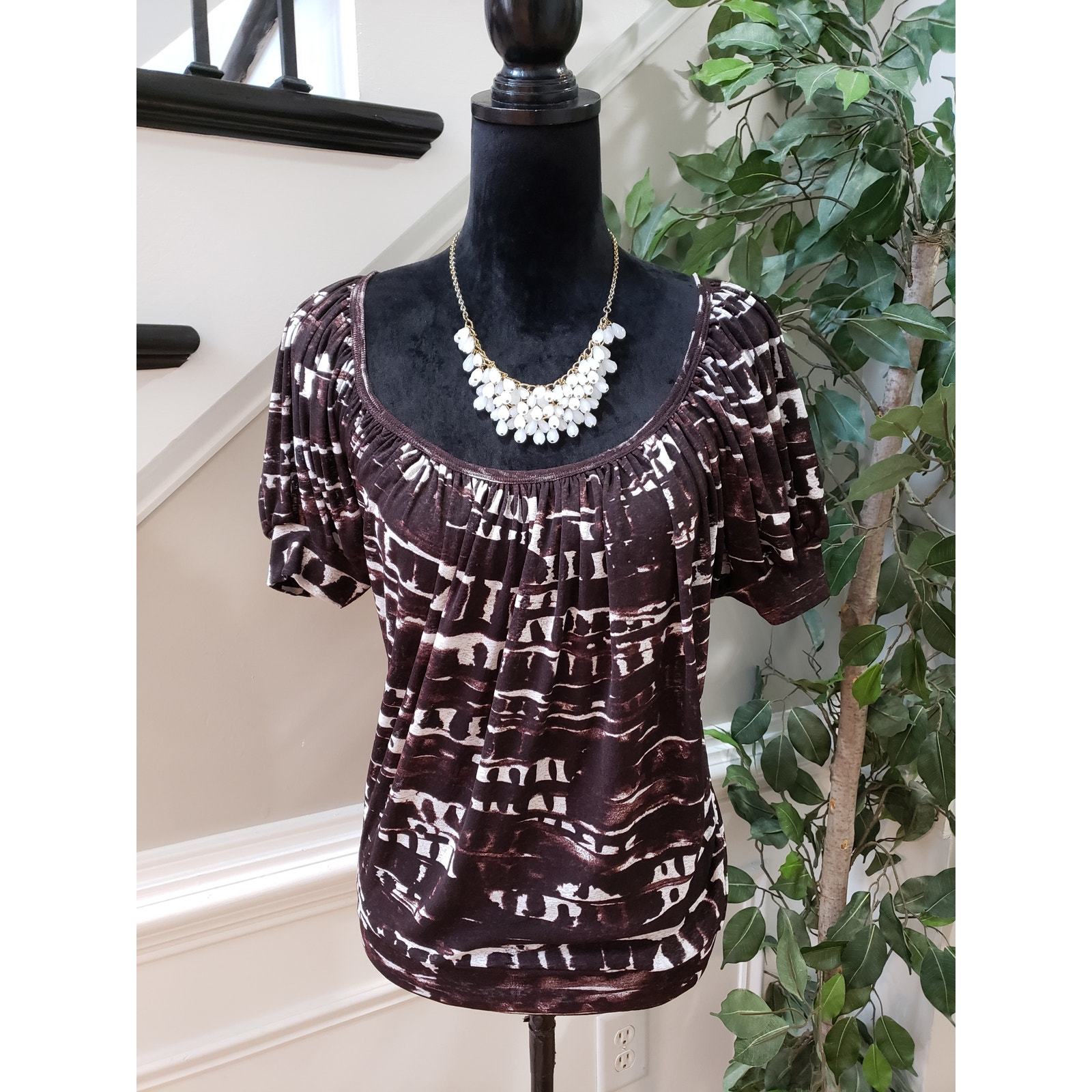 Karen Kane Top Blouse Women's Size Large Brown Geo Print Short Sleeve Scoop Neck