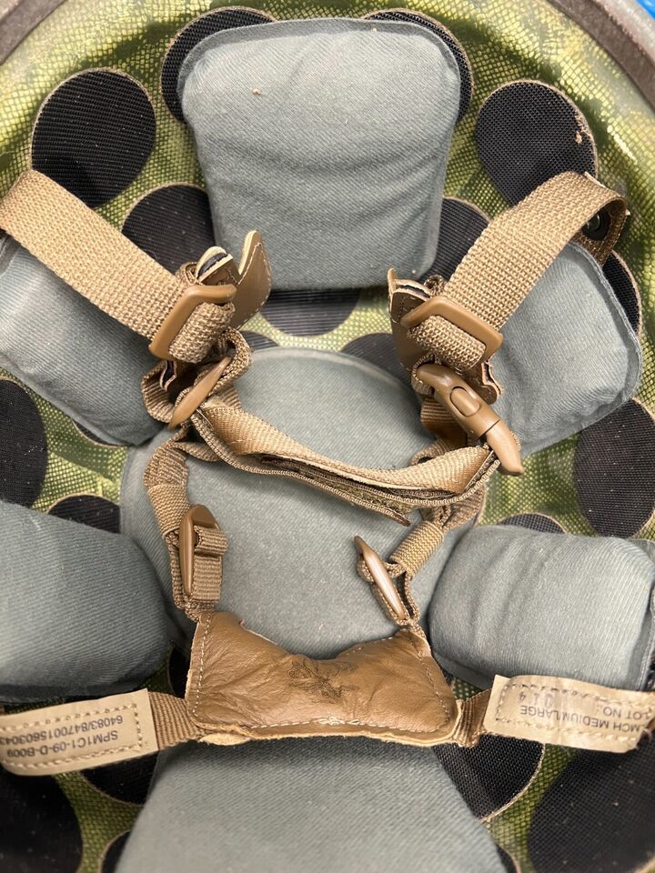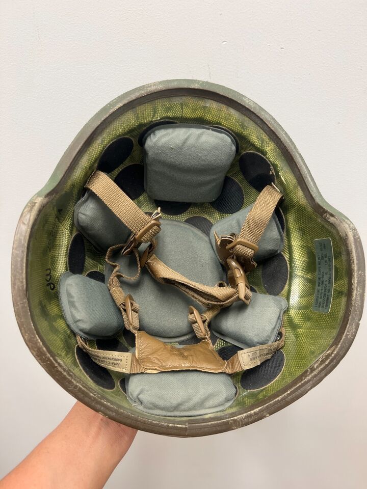 ORIGINAL US MARINE CORPS ISSUE - USMC GENTEX LEVEL IIIA LIGHTWEIGHT MARINE CORPS COMBAT KEVLAR HELMET, COMPLETED WITH CHIN STRAP, PADS SUSPENSION SYSTEM.