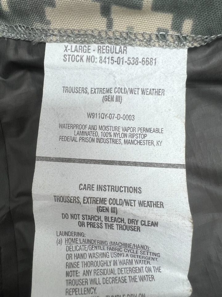 USGI ECWCS ACU GEN III LEVEL 6 EXTREME COLD/WET WEATHER PANTS - X-LARGE REGULAR