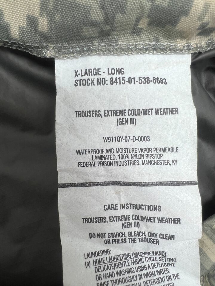 USGI ECWCS ACU GEN III LEVEL 6 EXTREME COLD/WET WEATHER PANTS - X-LARGE LONG