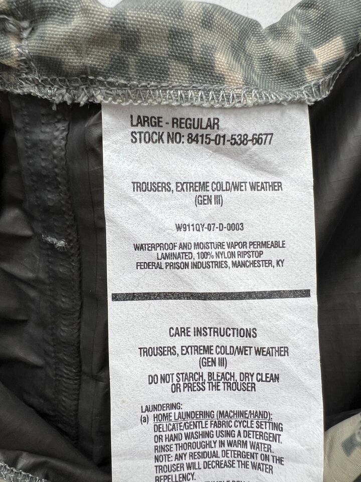 ORIGINAL US MILITARY ISSUE - ECWCS ACU DIGITAL GEN III LEVEL 6 EXTREME COLD/WET WEATHER PANTS.