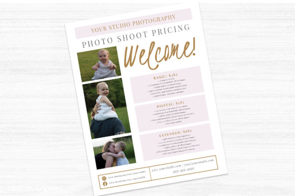 This price guide flyer template is perfect for sending to new potential photography clients who have inquired about your services! Present your pricing and packages in a clean, professional way, on this 8.5? x 11? flyer. Easily customize this template with your own photos, text, and colors using Adobe Photoshop (since you’re probably in there every day anyway!)