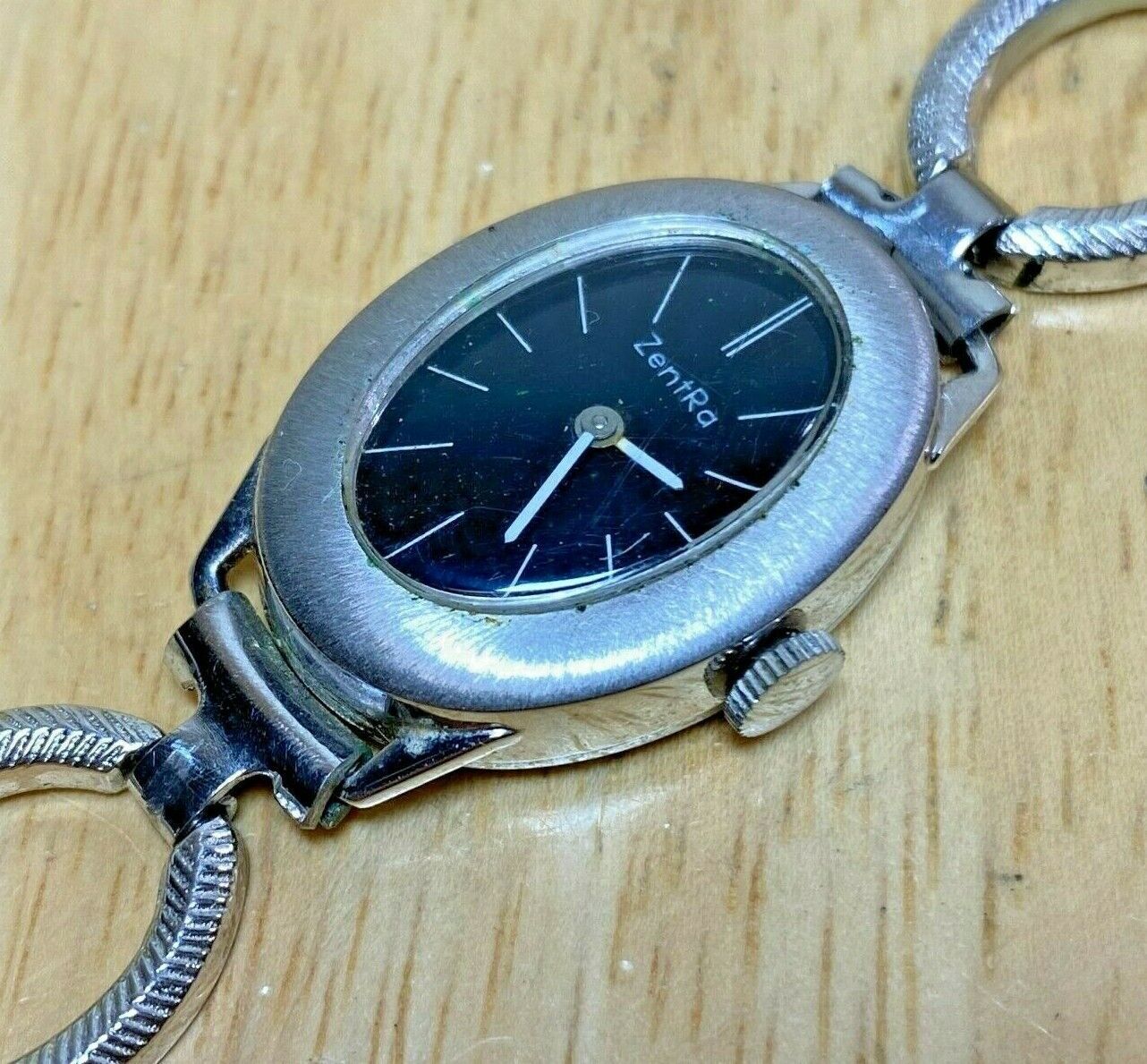 Vintage ZentRa Lady 17 Jewels Silver Black Oval Hand-Winding Mechanical Watch