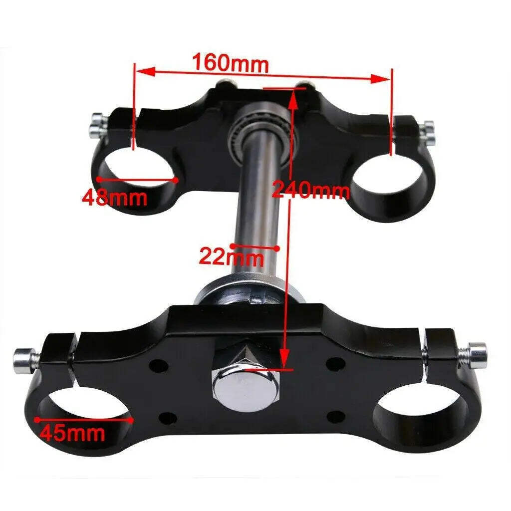 This 29-inch front fork suspension and triple tree clamp set is a high-quality replacement designed to improve performance on most 110cc and 125cc pit and dirt bikes. Built with a durable 45mm upper and 48mm lower leg diameter, this set offers stability and strength on rough terrains, while the 240mm center pole provides a secure fit for your bike?s front end. Engineered for easy installation, it?s compatible with many popular models, ensuring a snug fit and effective shock absorption for enhanced control and ride comfort. Perfect for dirt bikes and motorbikes, this set is an ideal choice for reliable, long-lasting performance. Brand new, high-quality 29-inch front fork suspension set and triple tree clamp designed for 110cc and 125cc pit and dirt bikes. Durable construction with a 45mm upper leg diameter and 48mm lower leg diameter, providing strong support for tough rides. 240mm center pole with a 22mm diameter and 160mm bolt distance ensures a secure fit and stable installation. Compatible with popular models, offering an effective replacement part for worn or damaged front forks. Easy installation with direct-fit design for quick setup; professional installation recommended for best results. Built to withstand challenging terrains, this set ensures improved shock absorption and handling for safer, smoother rides.