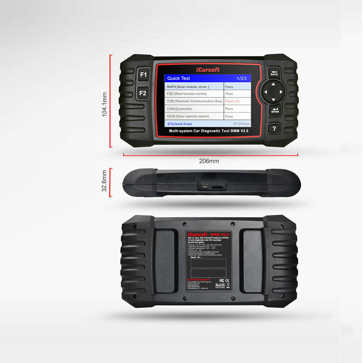 ICARSOFT BMM V3.0 IS A PROFESSIONAL AND POWERFUL VEHICLE FAULT DIAGNOSIS TOOL FOR BMW/MINI/ROLLS_ROYCE DEVELOPED BY ICARSOFT TECHNOLOGY INC. WITH A 4.0" TFT LCD AND UNIQUE DIAGNOSTIC SOFTWARE, IT FEATURES FULL ECU DIAGNOSIS OF SINGLE VEHICLE BRAND AND TEST MODES MAINLY INCLUDE: CANBUS, ISO9141, KWP2000, AND J1850 ETC. IT ENABLES TECHNICIANS TO ACCURATELY DIAGNOSE COMPLEX PROBLEMS.