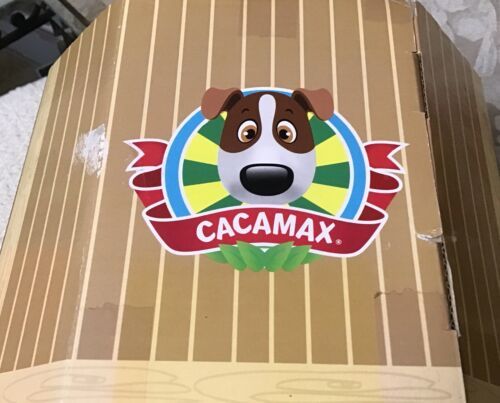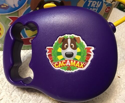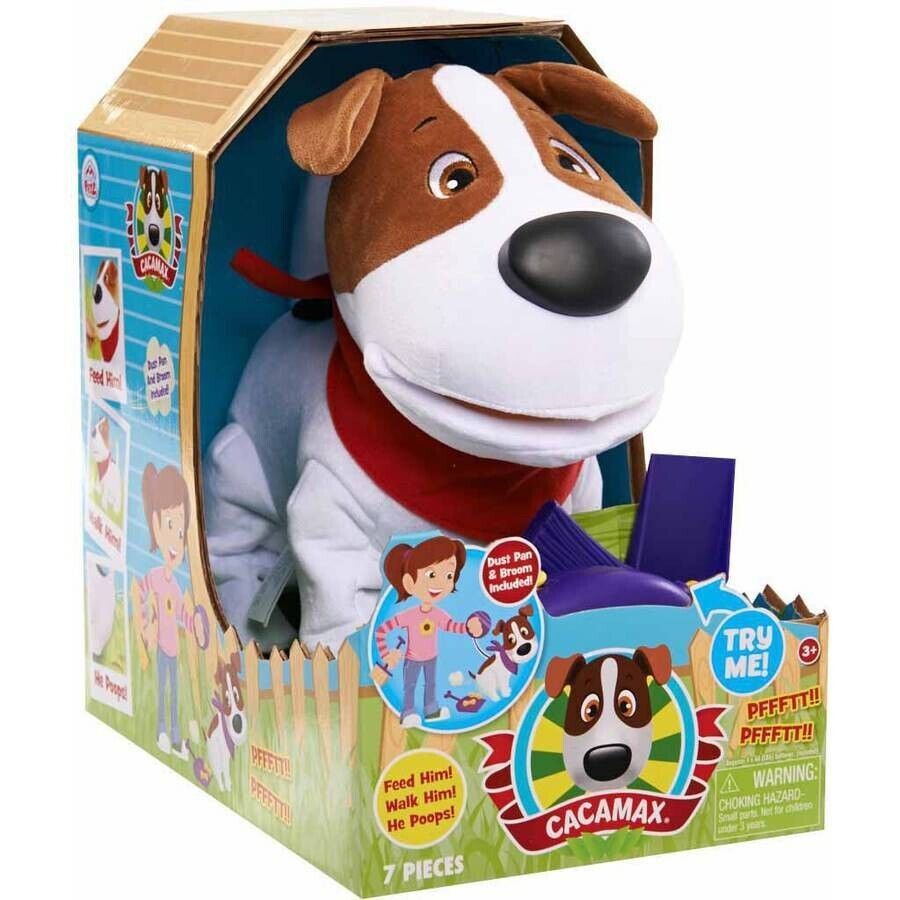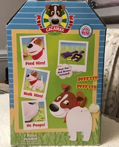 "The sweet little pooch CaCa Max makes a great companion. Even though he poops a lot! Feed him his bones, then take him for a walk by pushing the buttons on his tethered leash. He barks and makes other doggy sounds, like panting and farting. He'll follow commands to sit, and then relieve himself. A little dustpan and broom is included to clean up his mess. Go CaCa Max, go!"