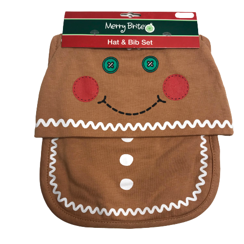 Merry Brite Baby Christmas Hat & Bib Set Gingerbread Man Cookie Infant Holiday