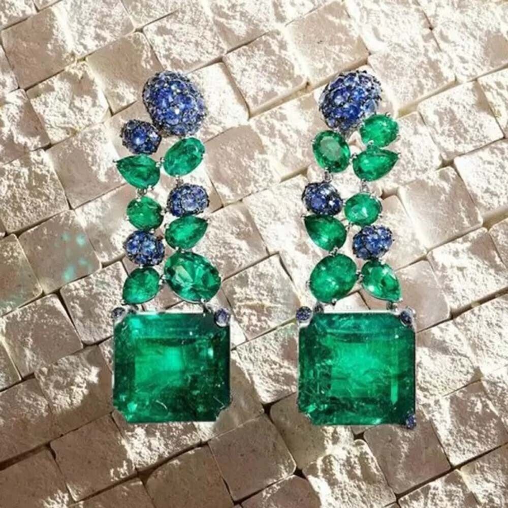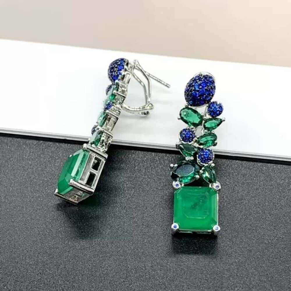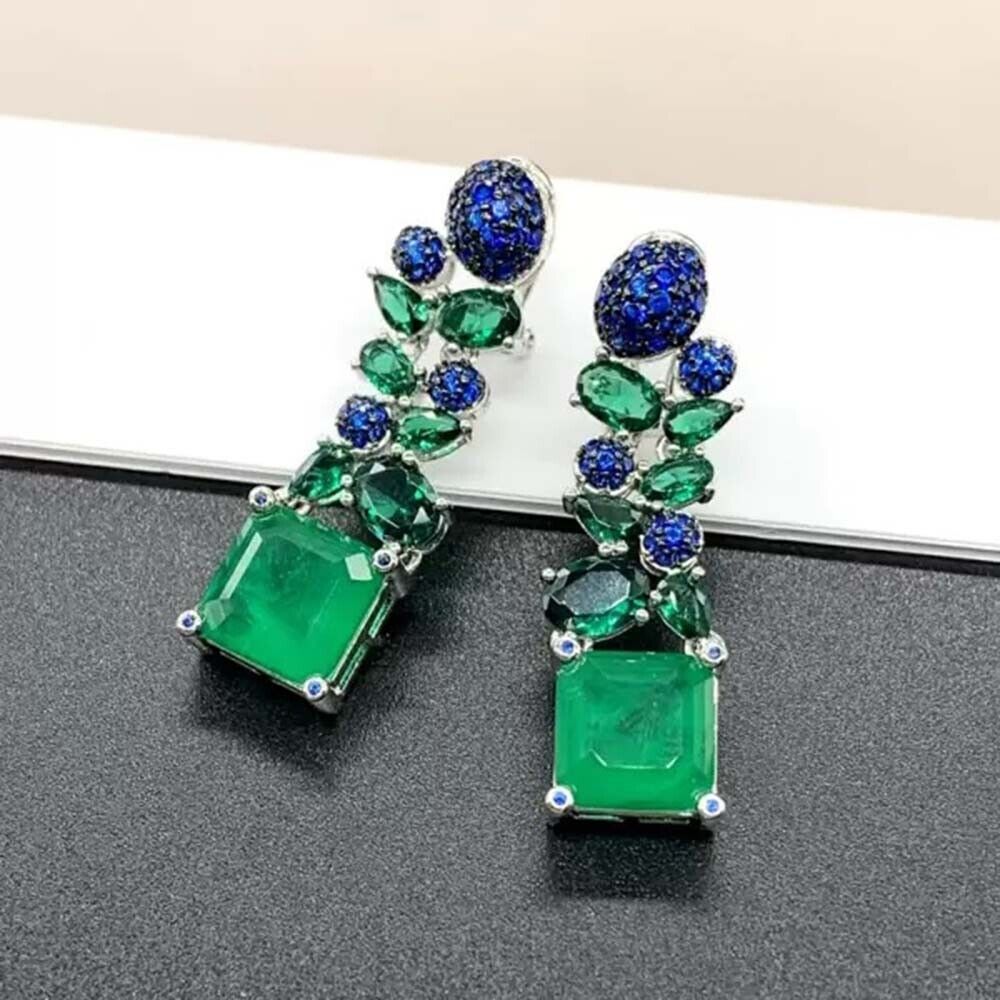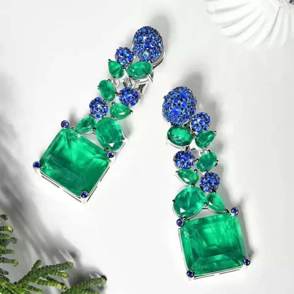 11 Ctw Created Sapphire & Emerald 14K White Gold Plated Gifts Statement Earrings