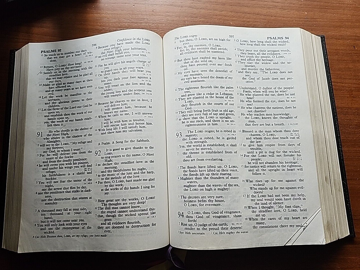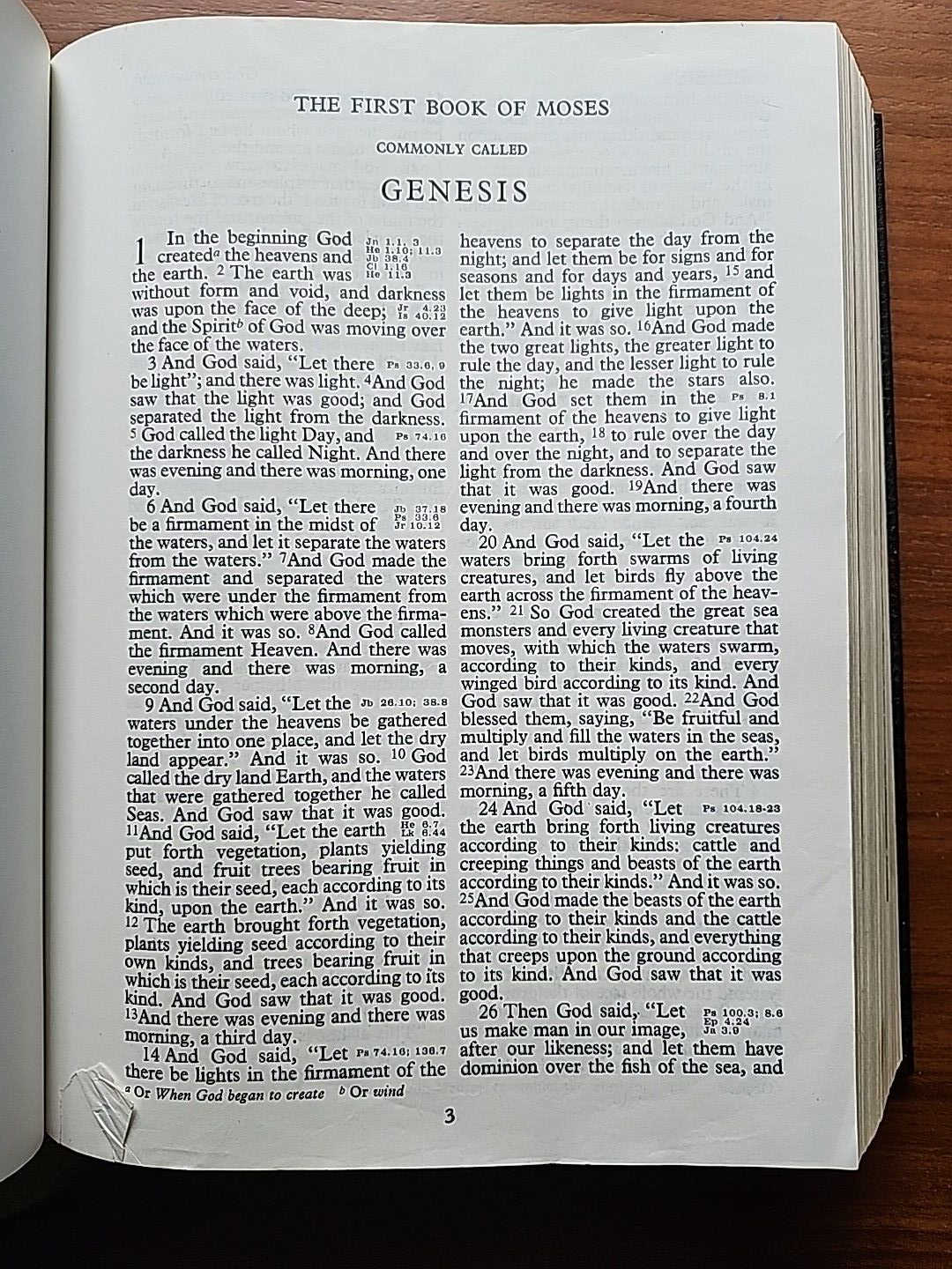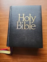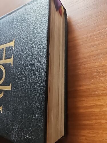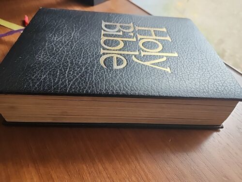 Red letter Edition, Revised Standard Edition. Large padded hard cover bible. 11 x 9 x 2.5 inches. Black with Gold-colored lettering. Family history pages are not filled in, I see no writing throughout text. Book is solid. There is a previous bookstore sticker on inside front cover. A few corner creases and I se one page with small tear on margin edge. Please see photo of this. I did not go through each page. Includes Concordance and encyclopedic index. 1260 pages plus 127 pages of index plus 107 and 61 pages of miscellaneous sections in back. A few pages have a star or checkmark written by a verse. Pages are very smooth and clean. 3 cloth bookmarks attached.