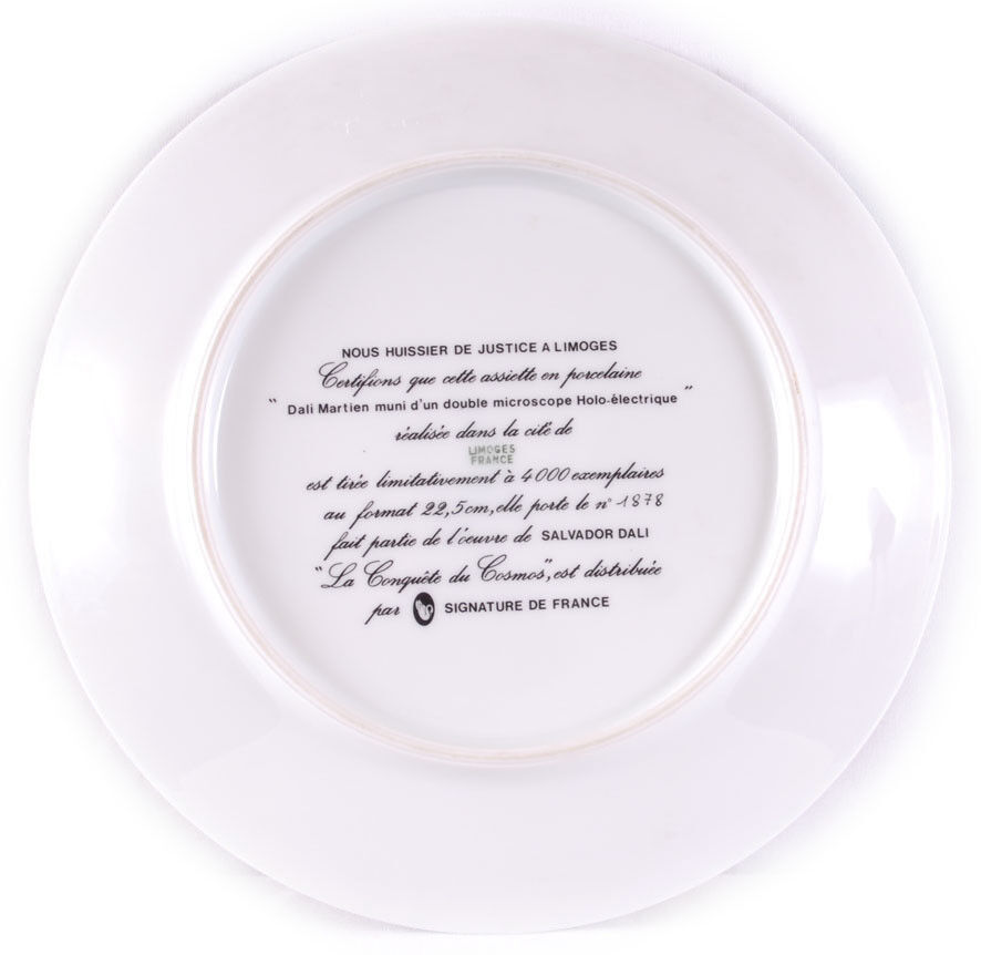 "Dali Martien muni d'un double microscope Holo-electrique" realisee dans la cite de LIMOGES FRANCE est tiree limitativement a 4000 exemplaires au format 22,5cm, elle porte le n 1878 fait partie de l'oeuvre de SALVADOR DALI "La Conquete du Cosmos", est distribuee par SIGNATURE DE FRANCE