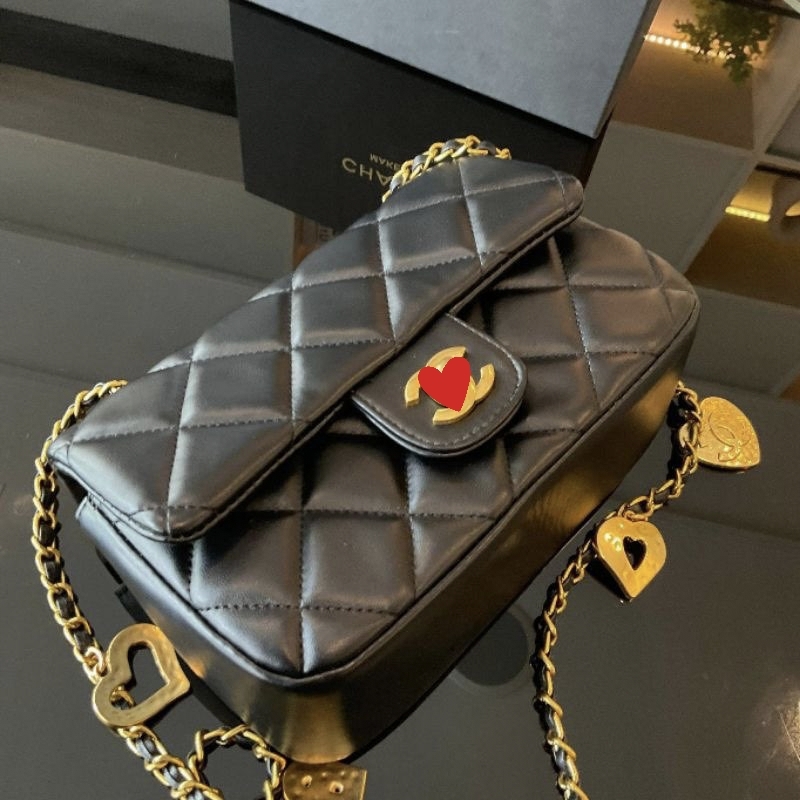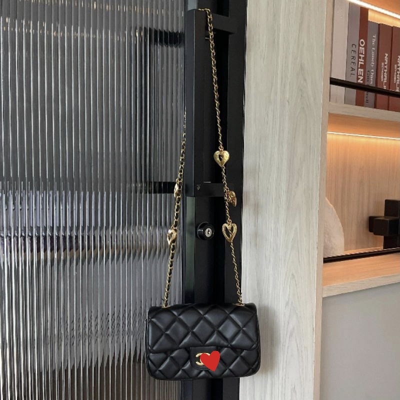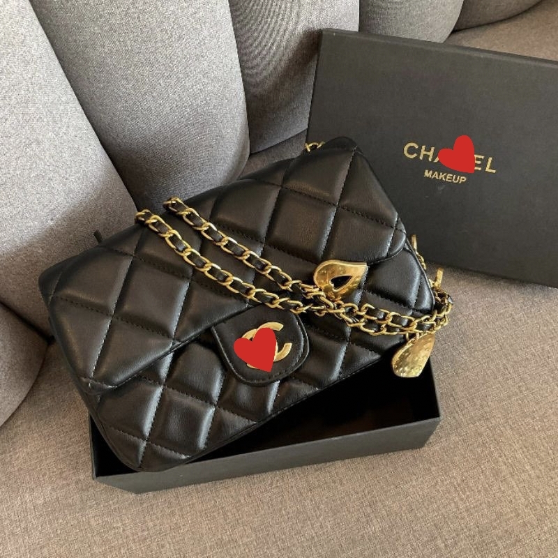 Elegance Novelty Crossbody Bag with gold heart chain. Perfect for everyday use. VIP gift from C-H-A-N-E-L Beauty.