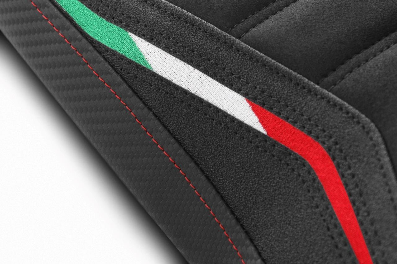 Introducing the Italia Sport rider seat cover for the Aprilia RS 660 and Tuono 660! The Italia Sport Seat Cover was designed to mirror the speed and aggressiveness of the bike. Featuring TecGrip side panels and rear carbon fiber sections with red contrast stitching. The premium synthetic suede riding surface is framed with aggressive stripes and an angular Italian stripe embroidery completes the look. Stand out with Luimoto!