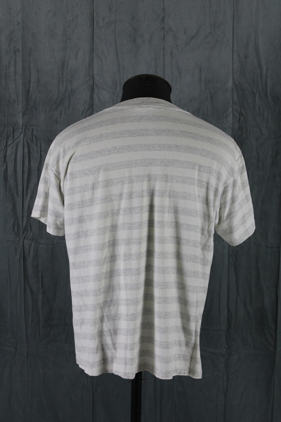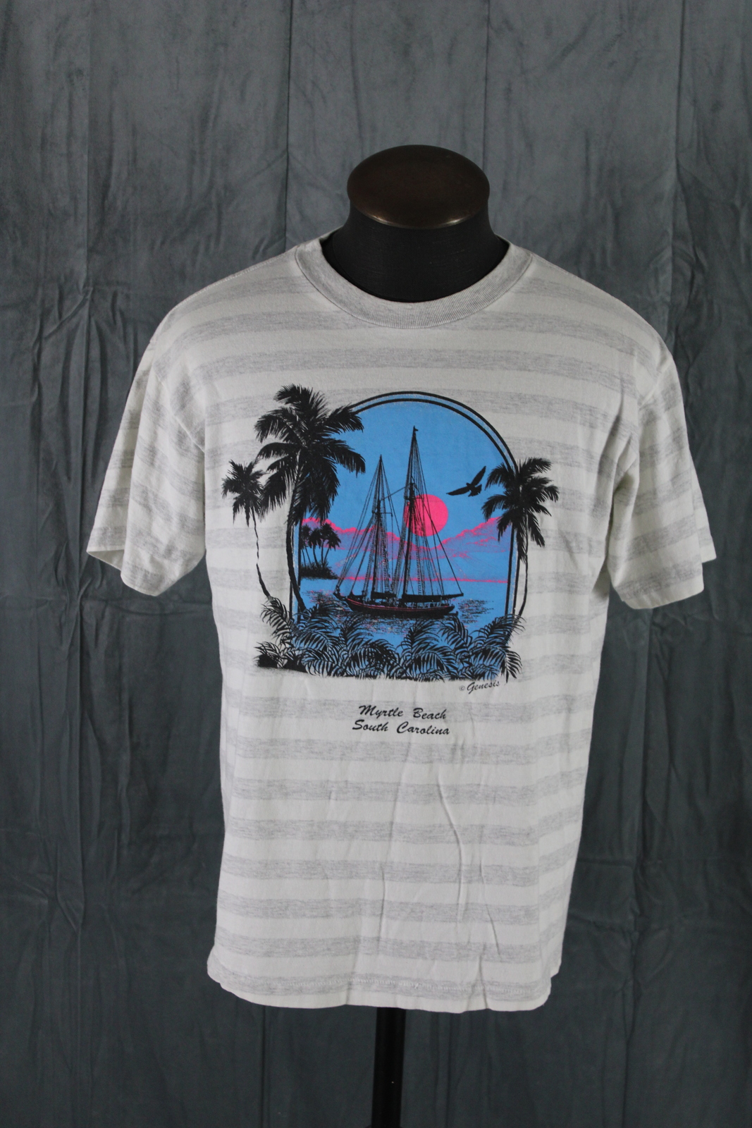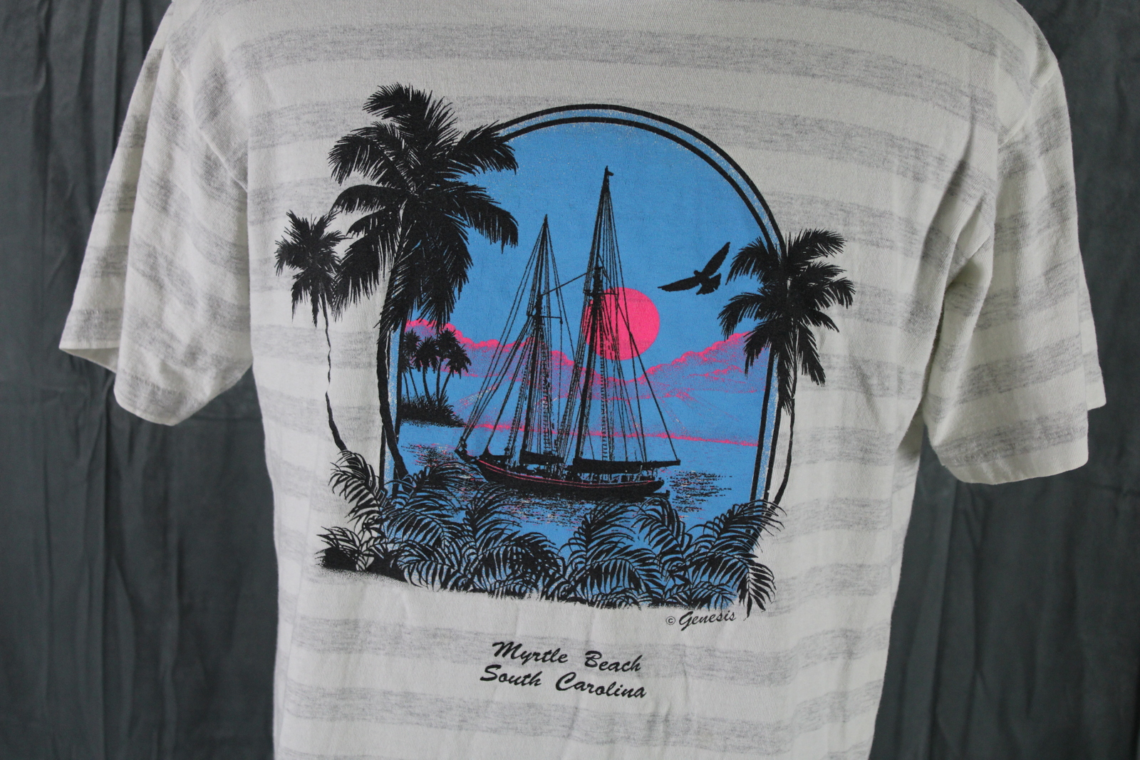 Up for sale is a vintage graphic t-shirt. It has a grey and white stripe base pattern. The front of the shirt has a neon graphic on ships by a beach with Myrtle Beach underneath. What a great vintage shirt do not miss out on it.