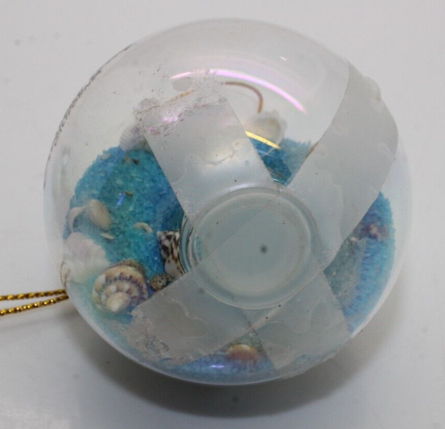 Round Ornament From Crescent City Ca is full of tiny shells and blue sand, Has tape over plug on bottom