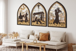 This set consists of 3 parts in the shape of cathedral windows and each part has 6 layers. You can create interesting holy christmas decor.