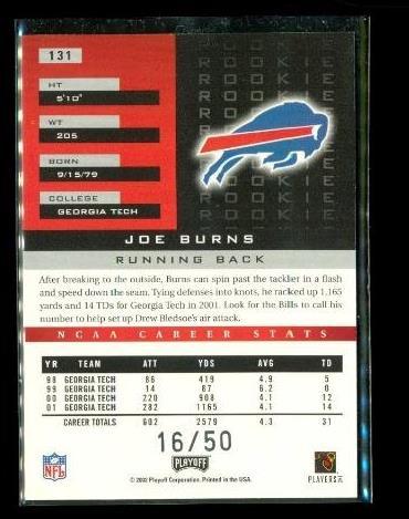 2002 Playoff Honors Os 16/50 Joe Burns #131 Rookie RC Buffalo Bills Football