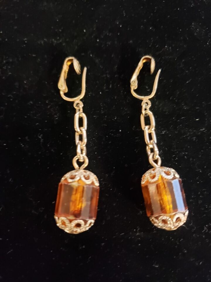 1970?s amber lucite bead clip on earrings with gold filigree and barrel chain. Gorgeous facets catch the light like honey. Signed Sarah Coventry and in good working condition.