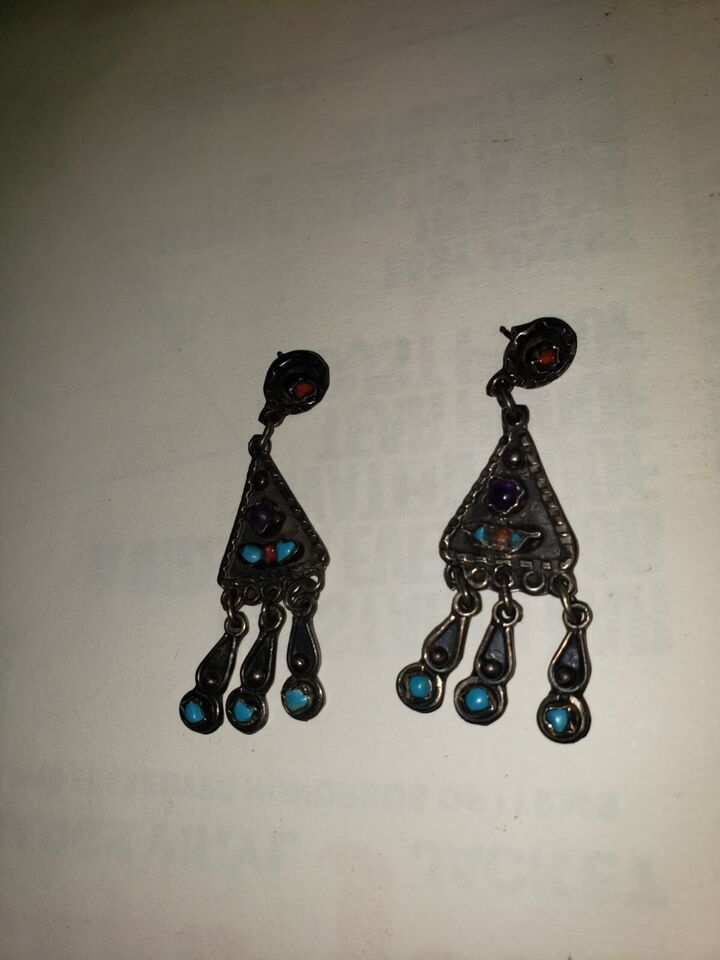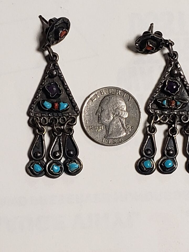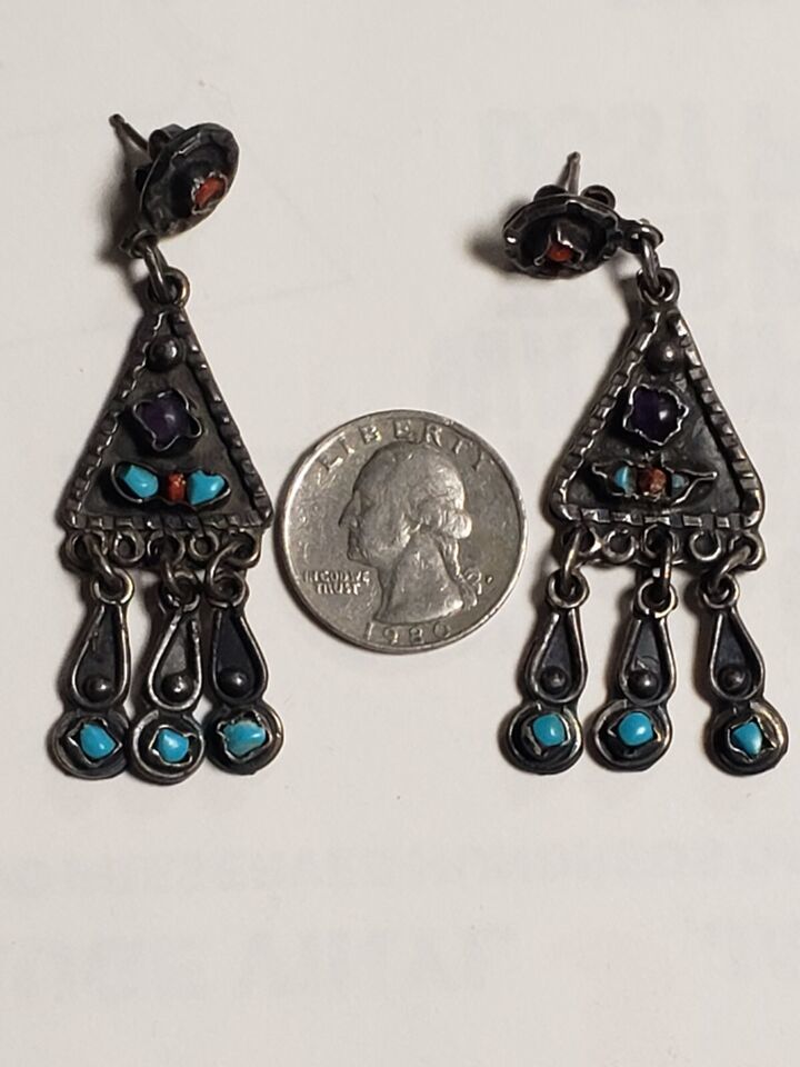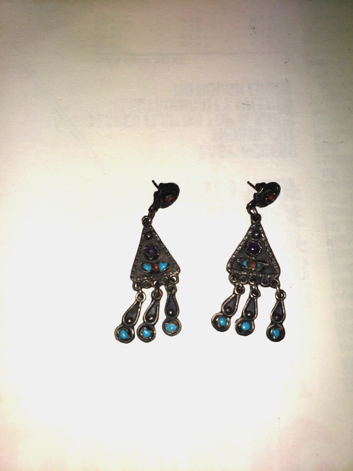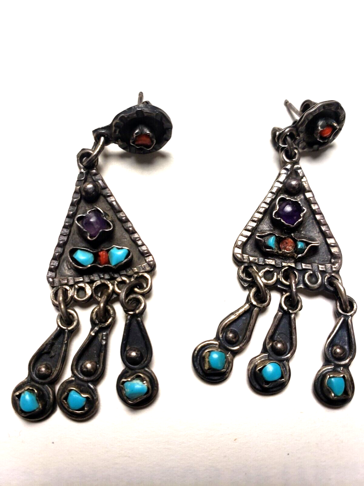 This is a great pair of vintage style inlaid stone dangle earrings. The earrings have inlaid Amethyst turquoise, coral They measure 2 5/8 inches long from top to bottom. They are marked MEXICO TC-153 925. They are in very good preowned condition SEE PHOTOS FOR CONDITION DESCRIPTION