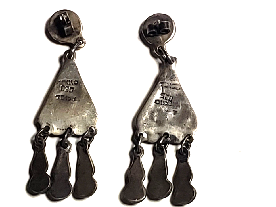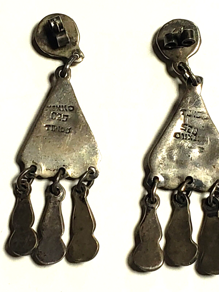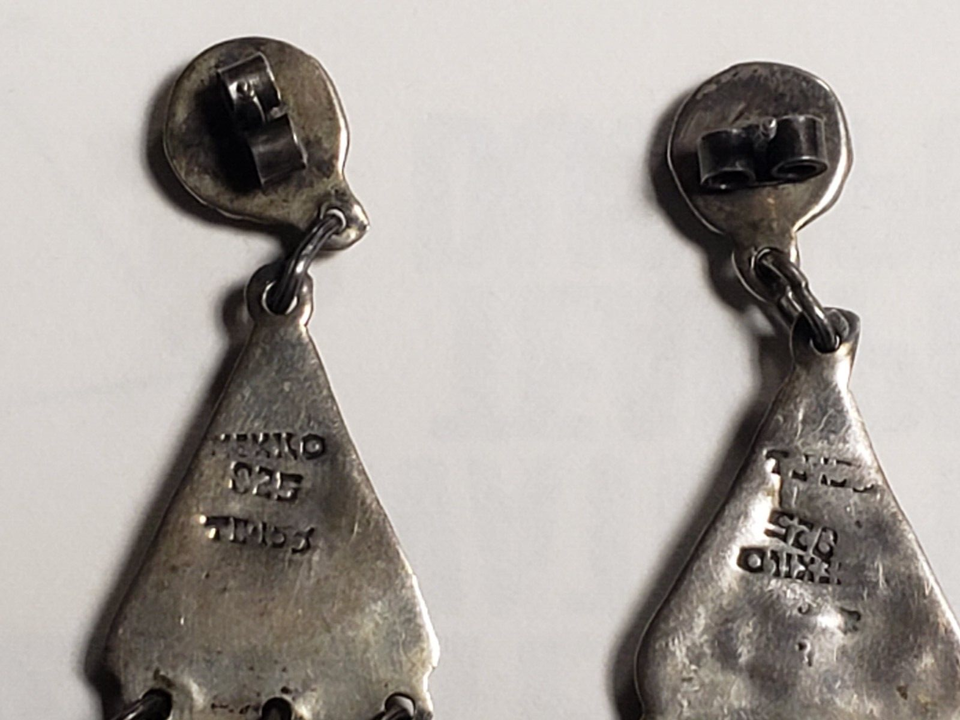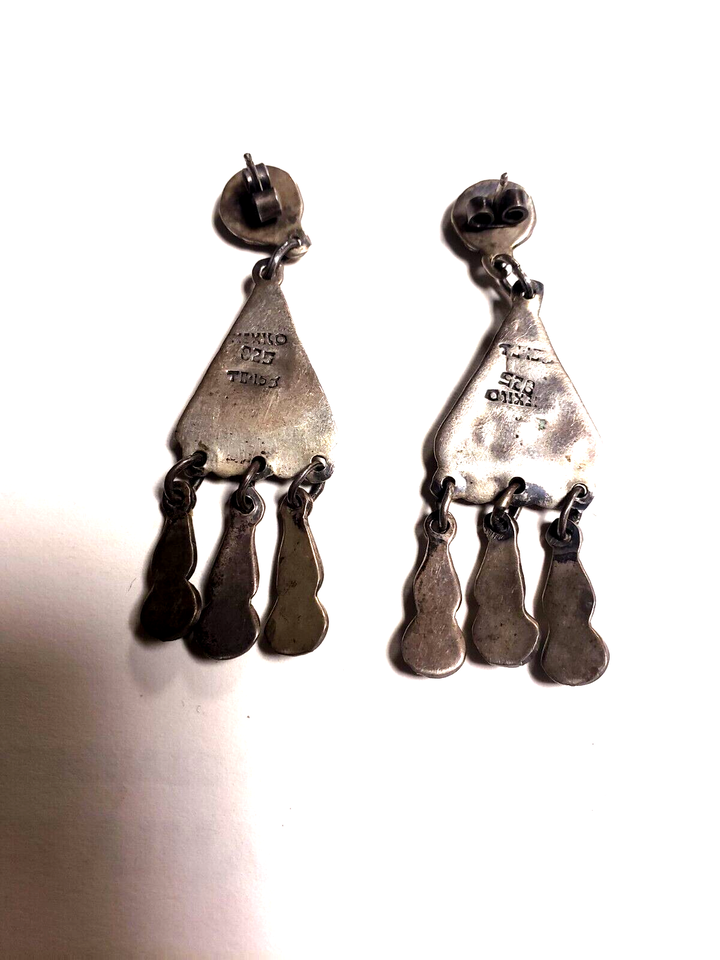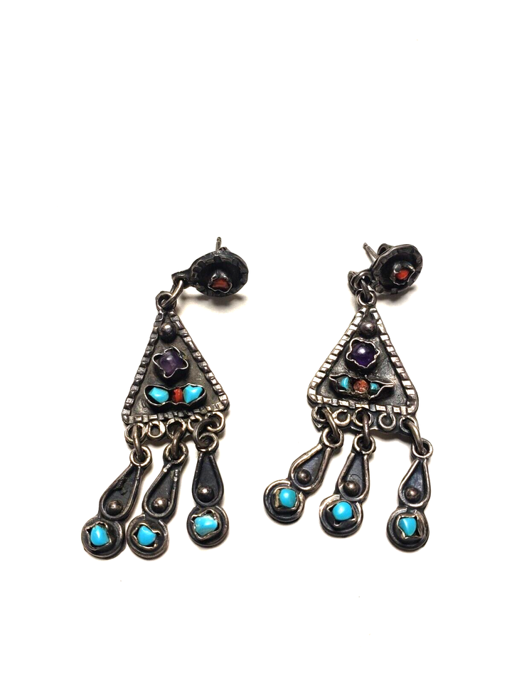 This is a great pair of vintage style inlaid stone dangle earrings. The earrings have inlaid Amethyst turquoise, coral They measure 2 5/8 inches long from top to bottom. They are marked MEXICO TC-153 925. They are in very good preowned condition SEE PHOTOS FOR CONDITION DESCRIPTION
