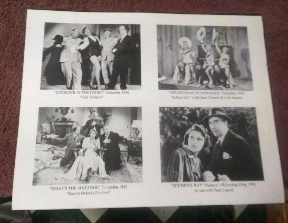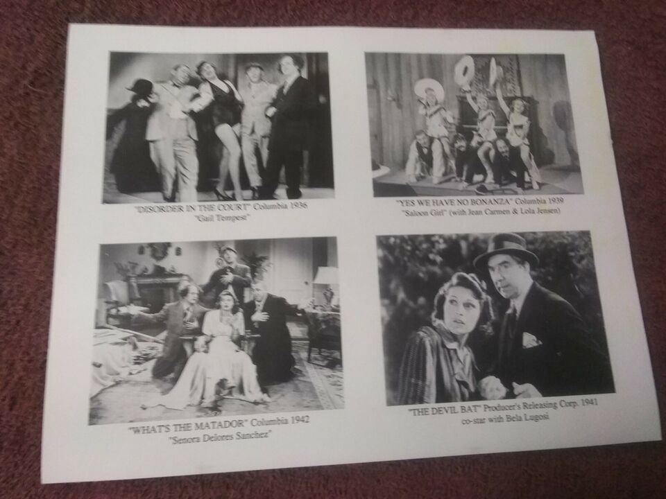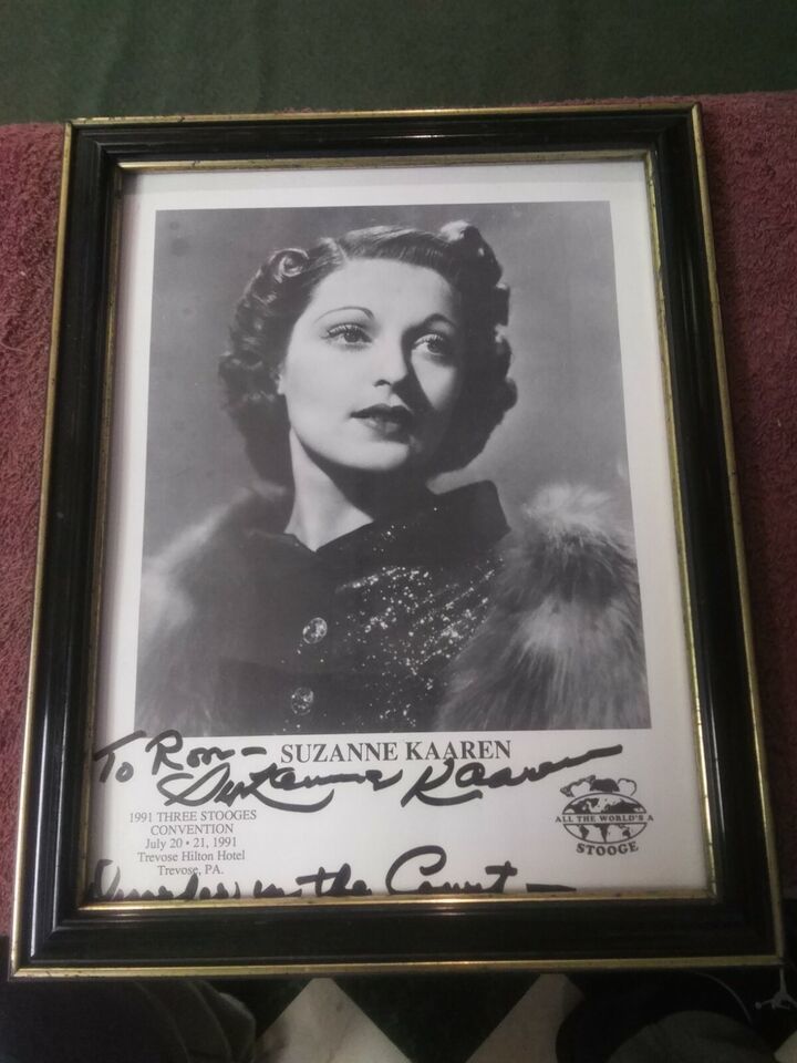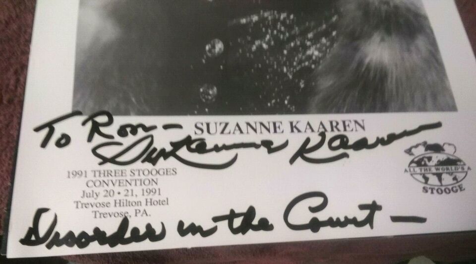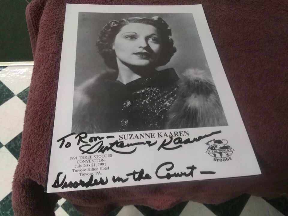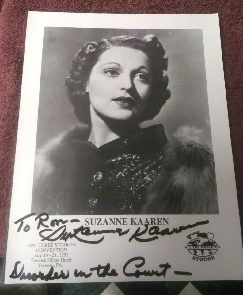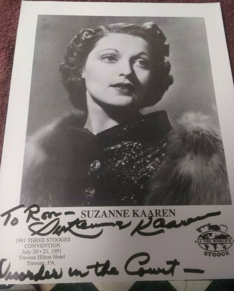 This is an original signed card / photo of Suzanne Kaaren at a 1991 three stooges convention she an American B-movie actress and dancer who appeared in stock film genres of the 1930s and 1940s: horror films, westerns, comedies, and romances.